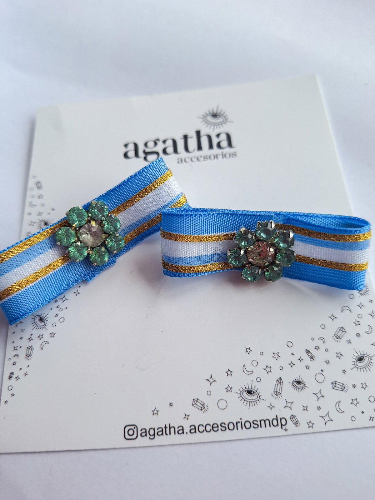 Escarapela realizada con gemas engarzadas soldadas y cintas.