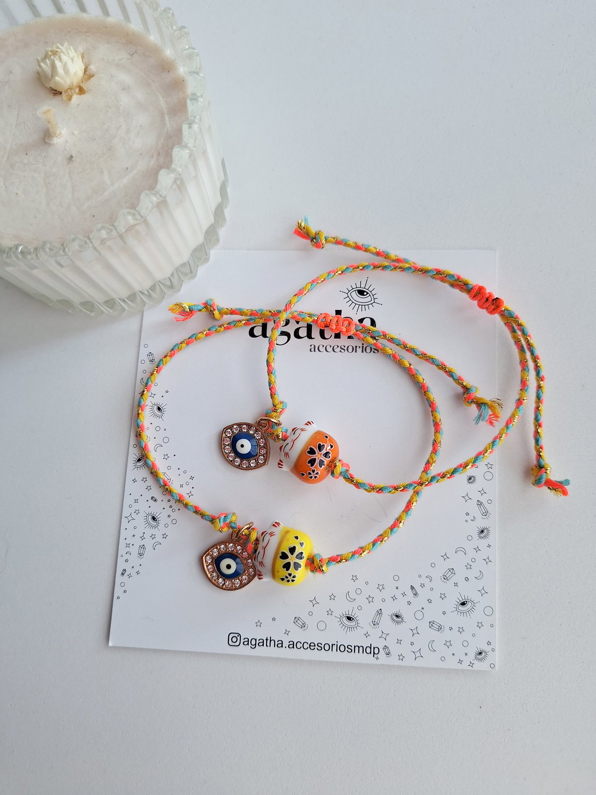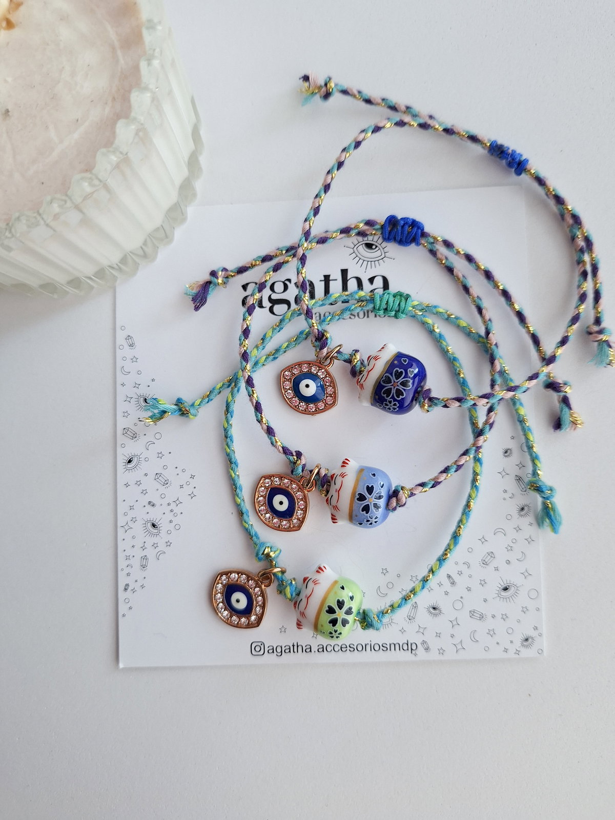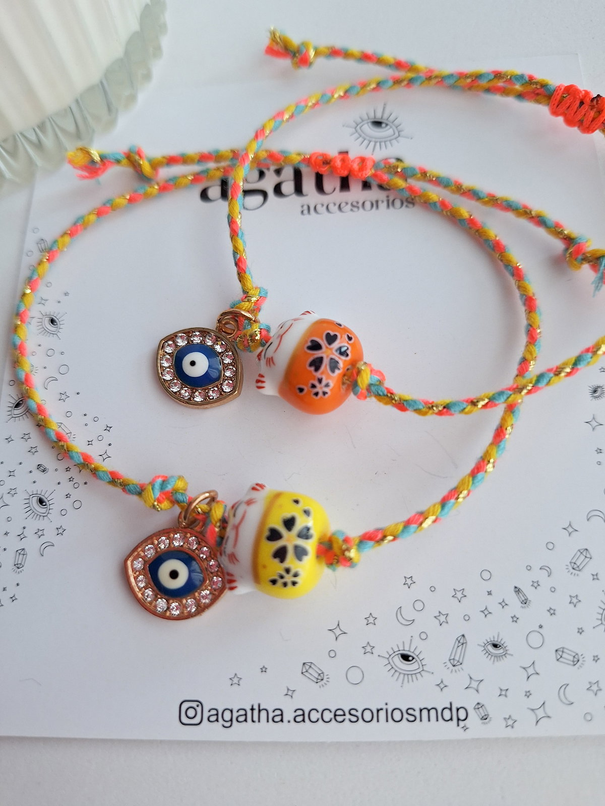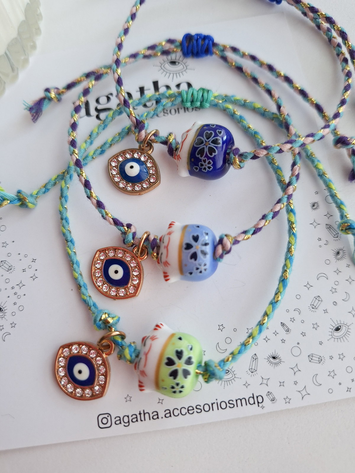 Pulsera realizada con hilo, dije de cerámica y ojito de fundición con strass. Cierre regulable.