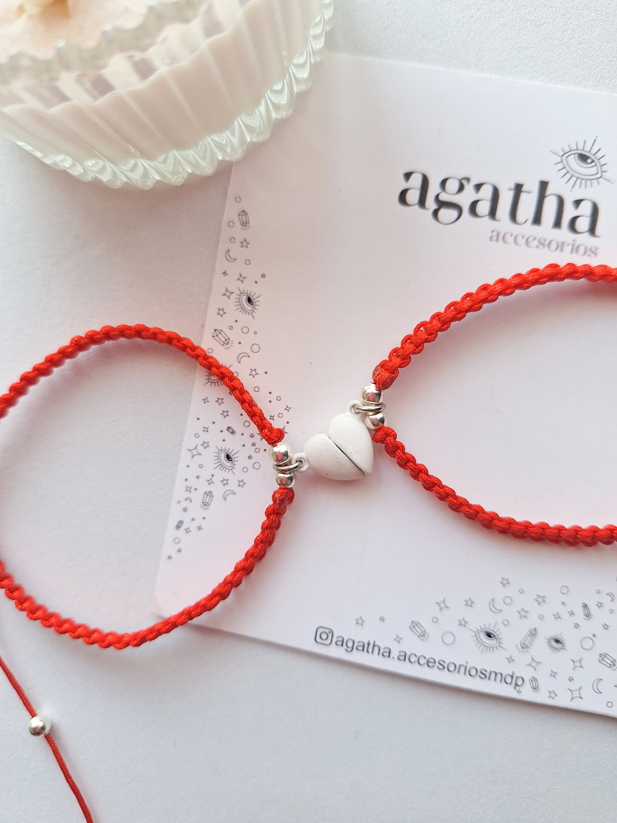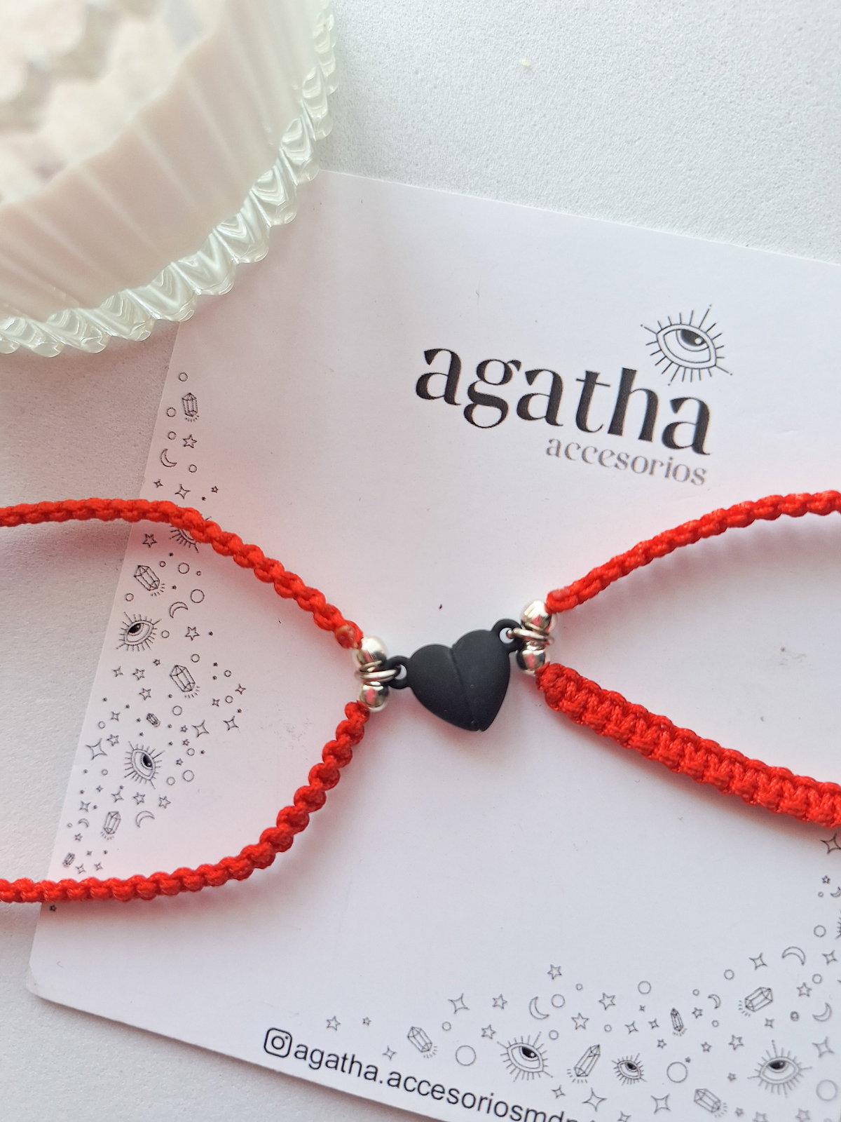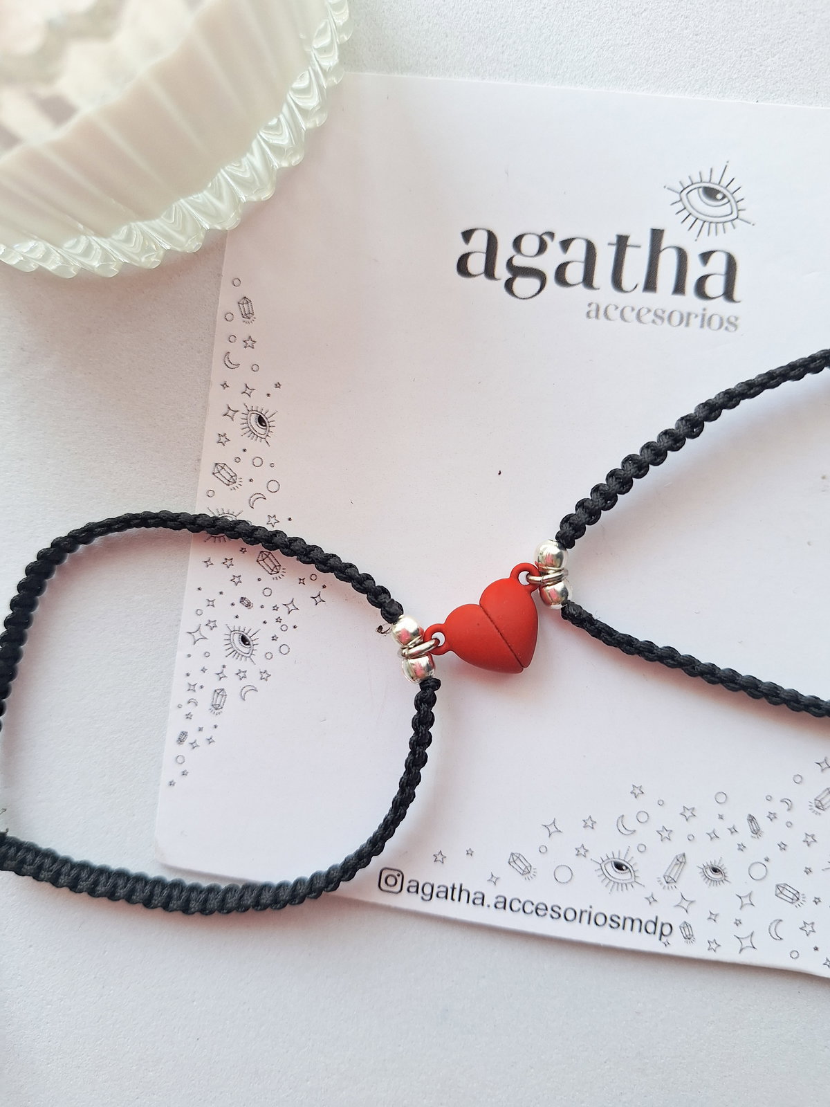 Dos pulseras realizadas en macramé con hilo chino y dije en forma de corazón con imán. Cierre regulable.