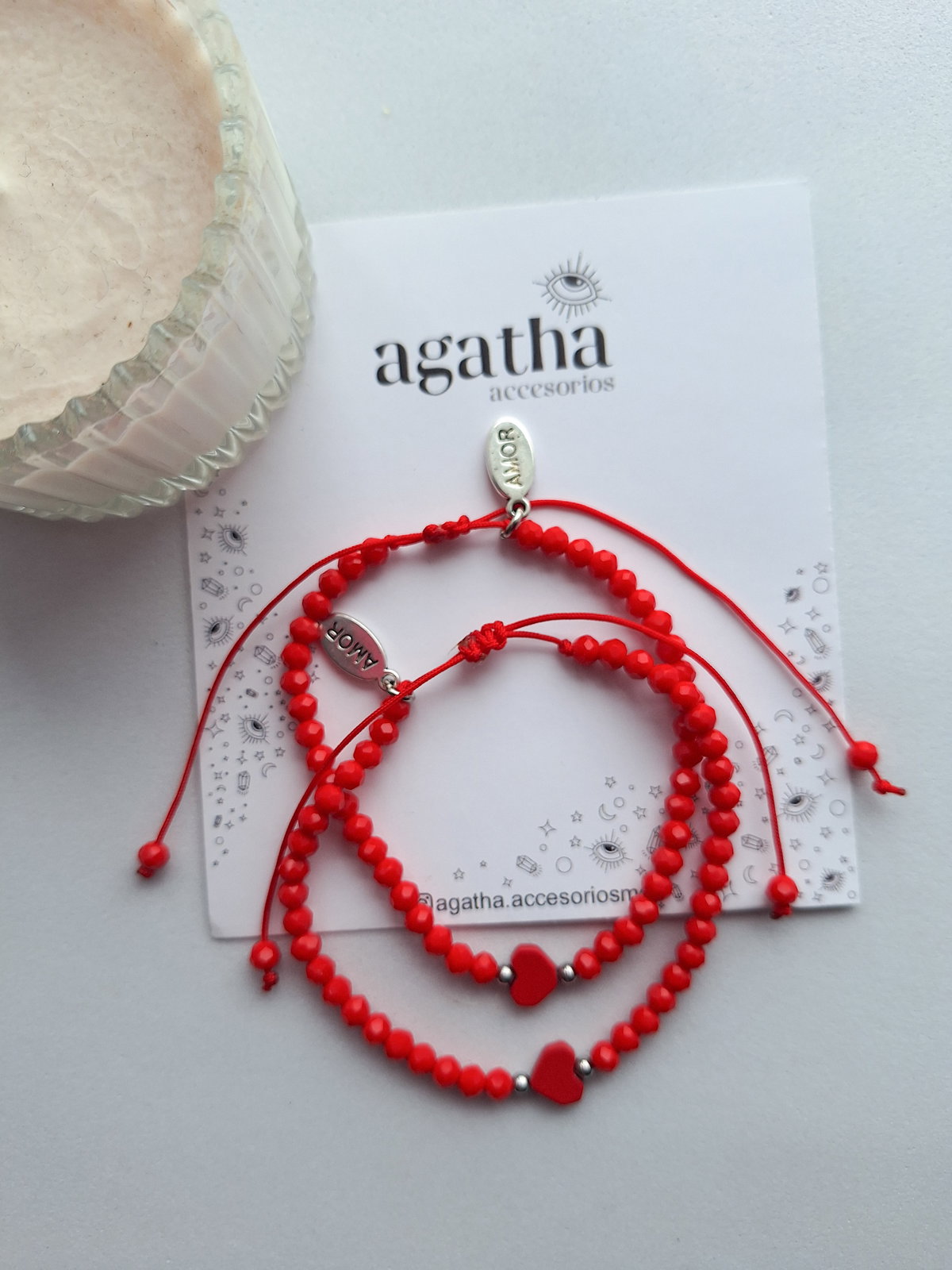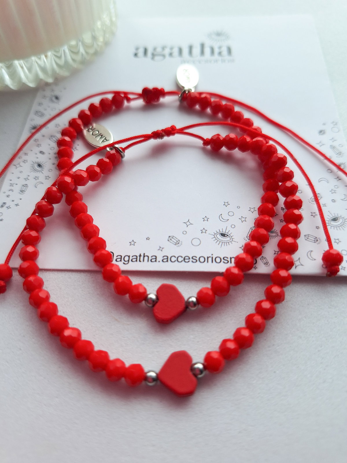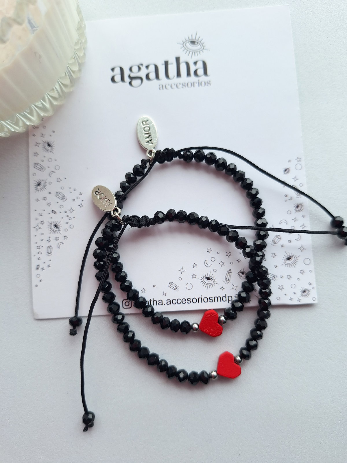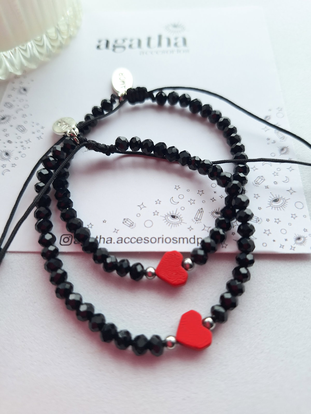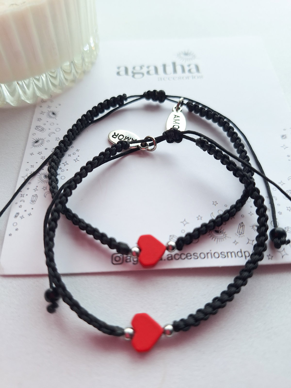 Pulsera realizada con hilo chino, un modelo con macramé y otros con cristales, separadores de acero quirúrgico, corazón de hematite y dije de fundición. Cierre regulable.