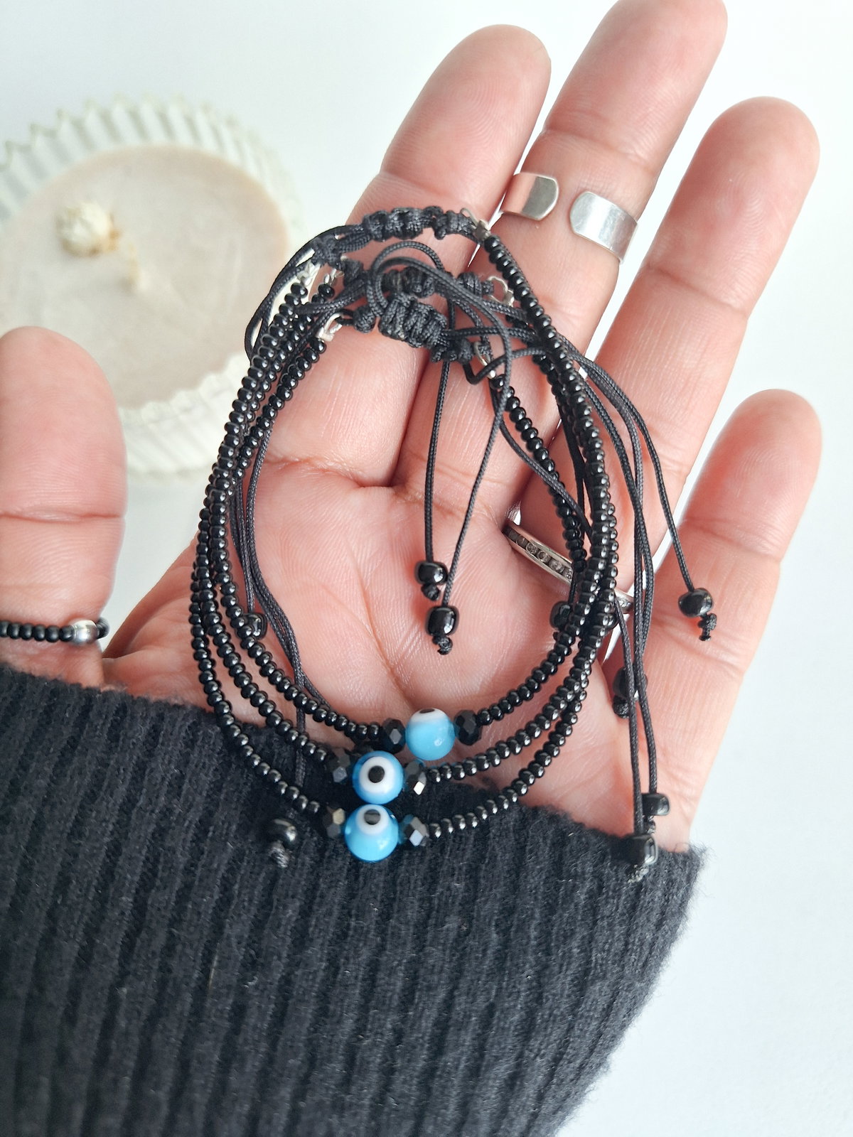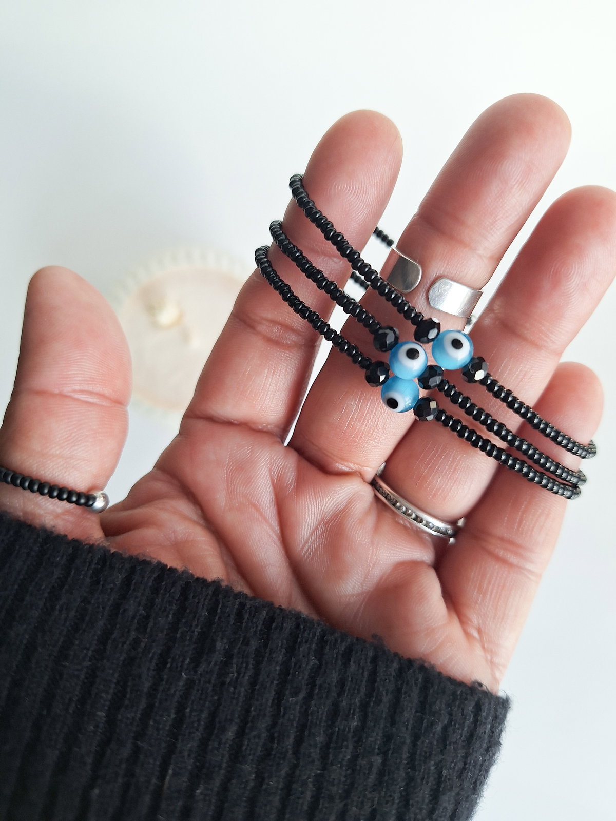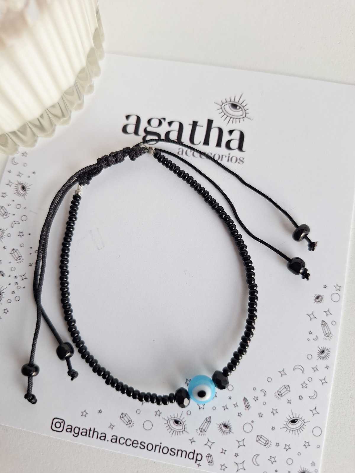 Pulsera realizada con mostacillas calibradas, cristales de 4 mm y ojito turco de vidrio. Cierre regulable.