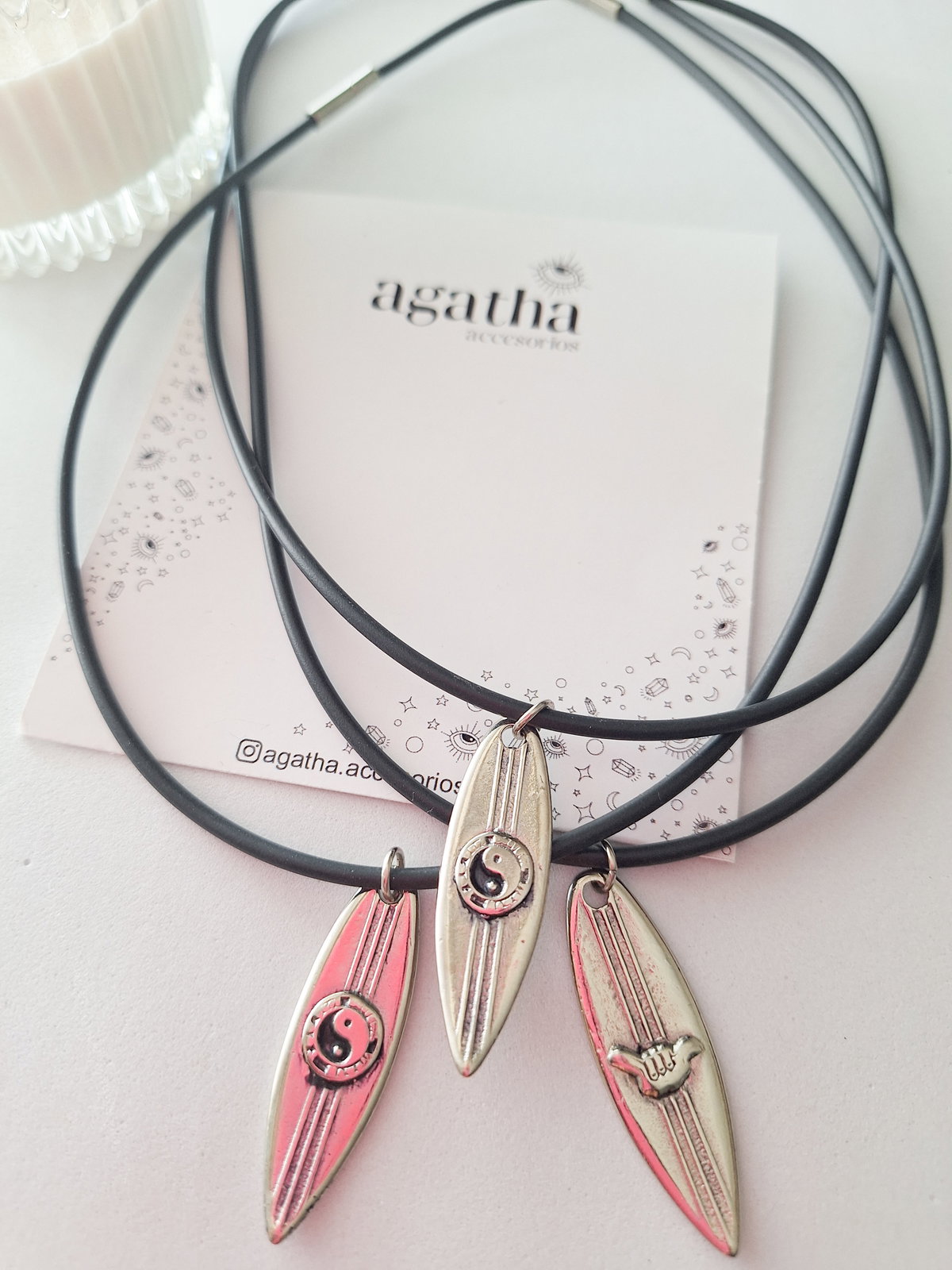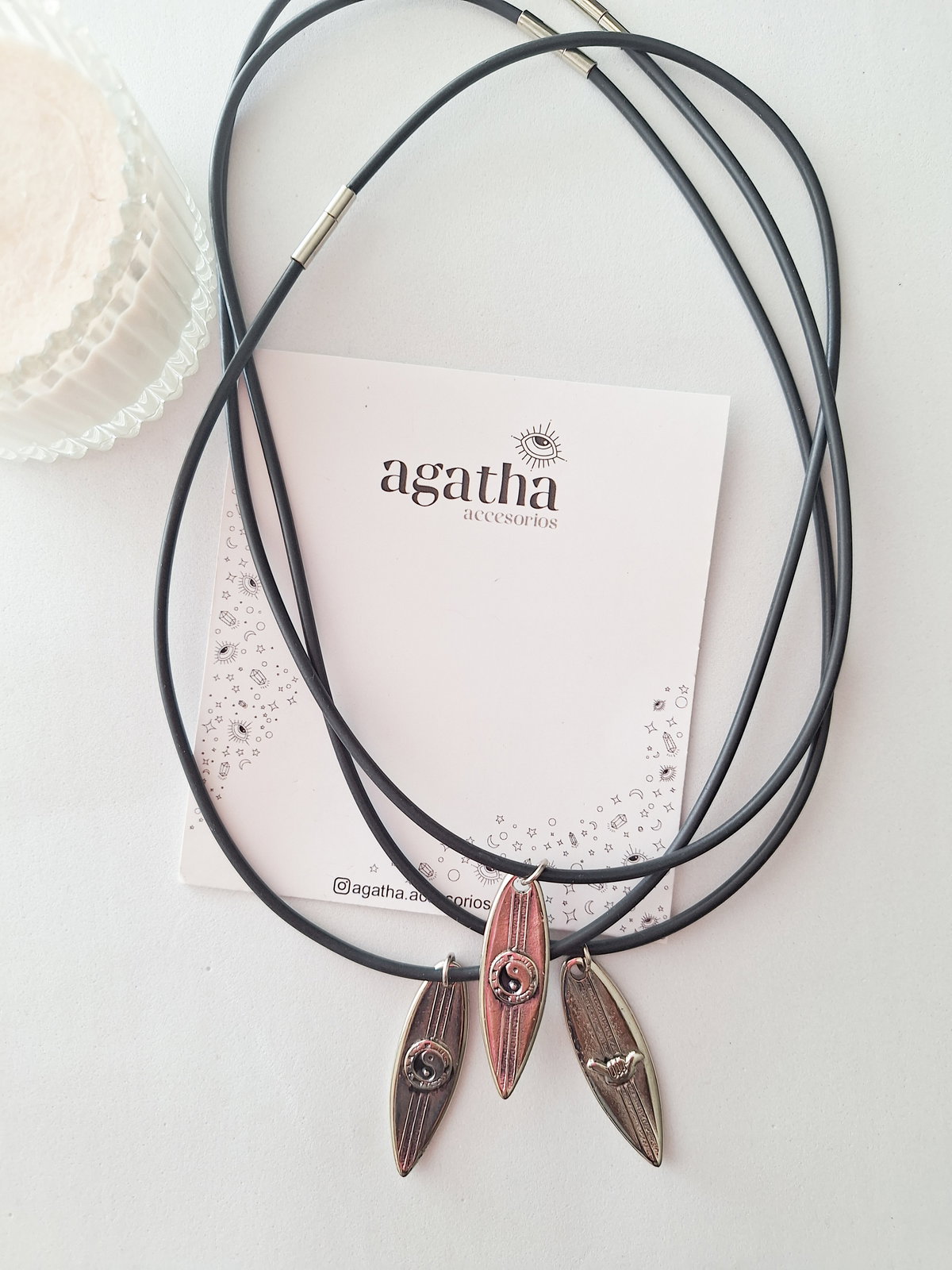 Collar realizado con caucho y dije de fundición. Mide 46 cm.
