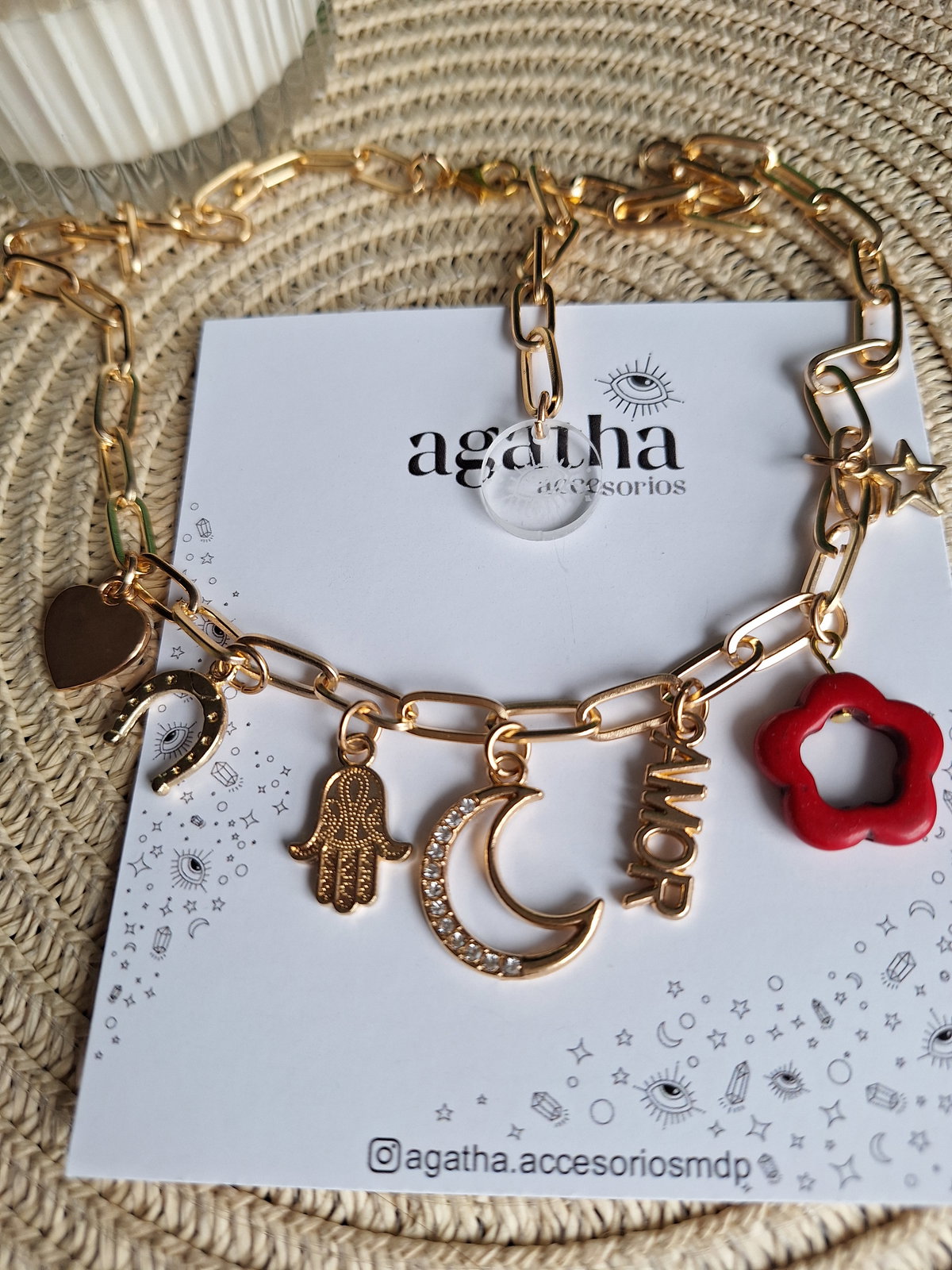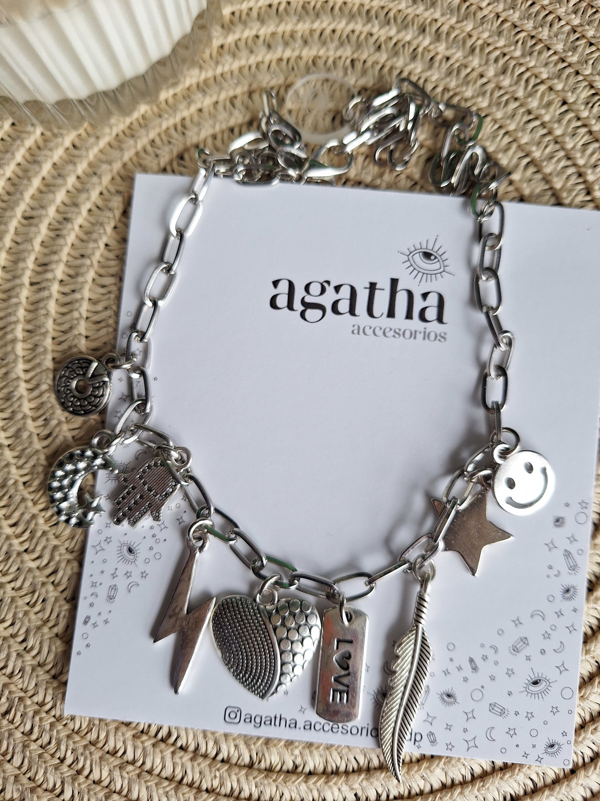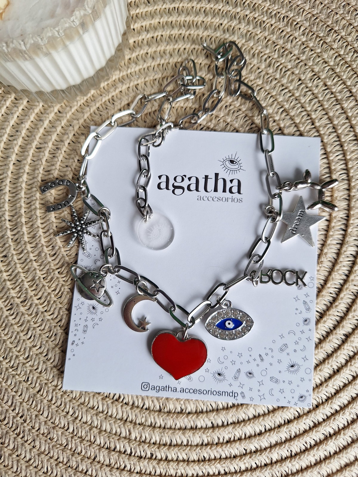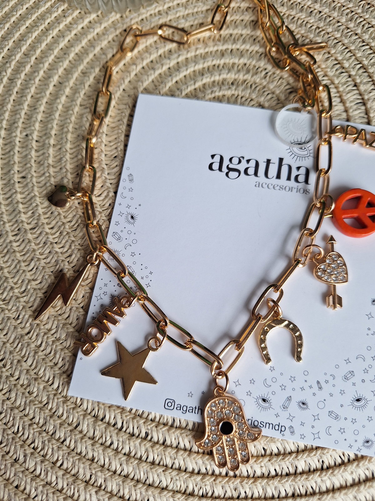 - Collar realizado con cadena de fundición y dijes del mismo material. Mide 44 cm. Cierre con mosquetón.