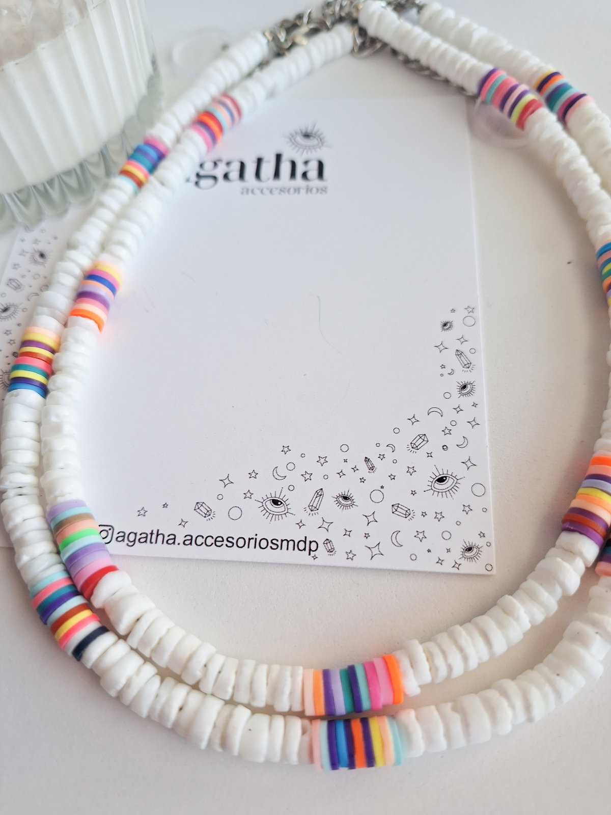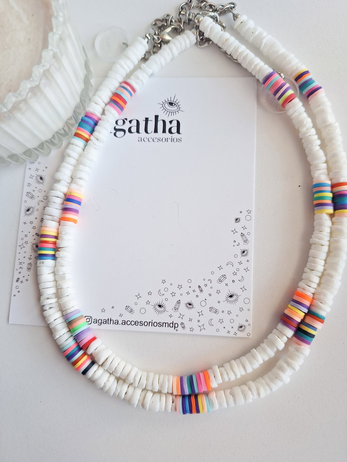 - Collar realizado con cuentas de nácar y fimo. Mide 36 cm más 8 cm de cadena de alargue. Cierre con mosquetón.