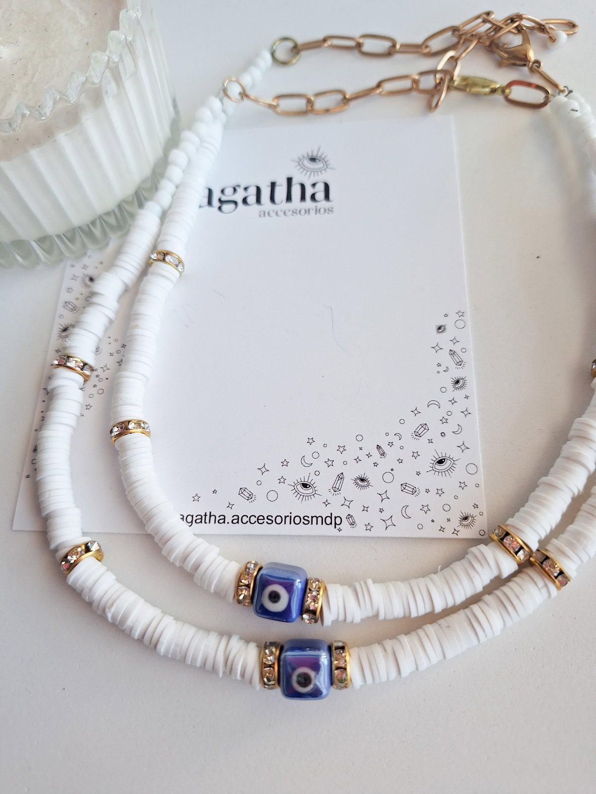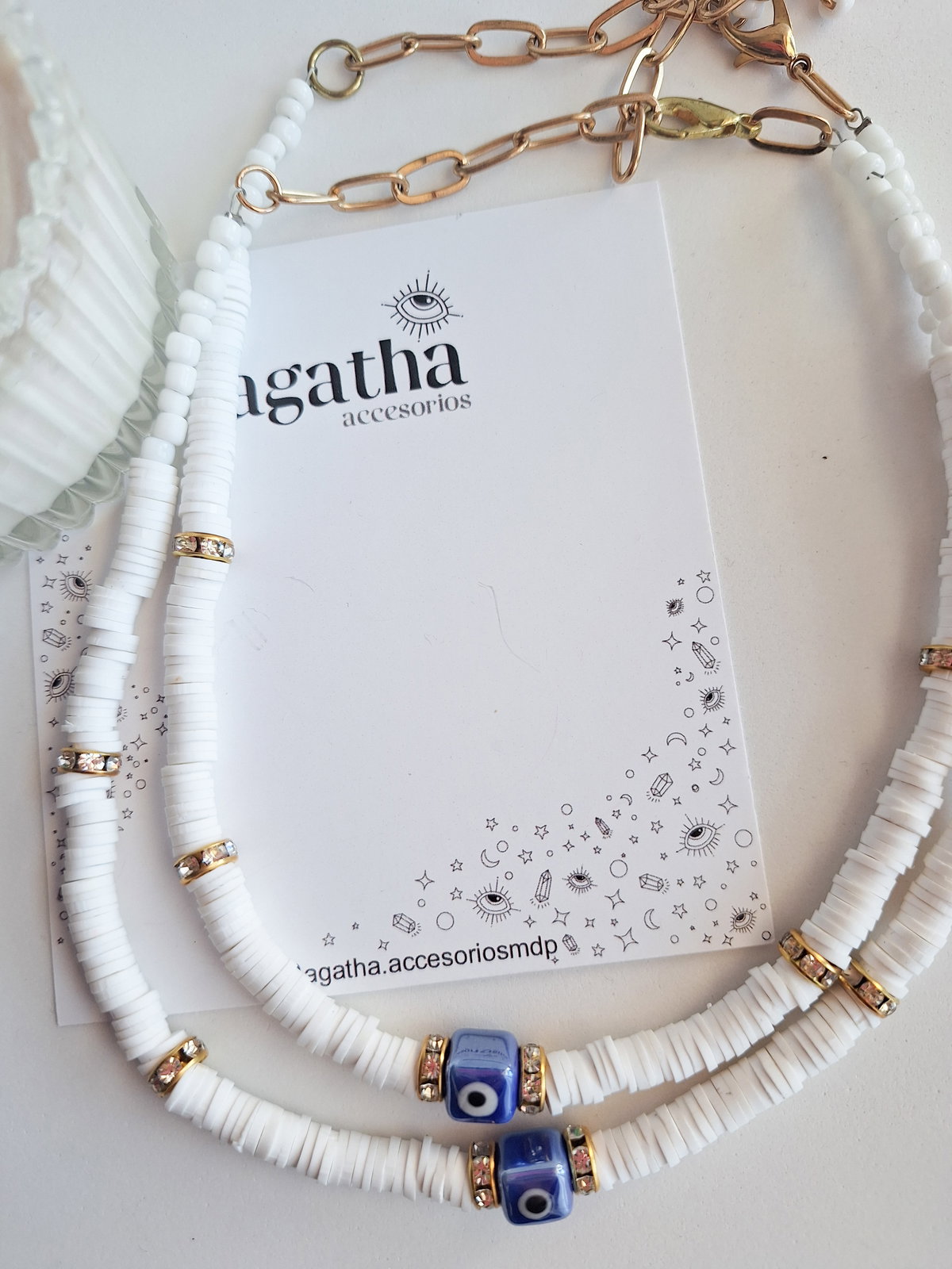 - Chocker realizado con cuentas de fimo, mostacillones, separadores de strass y ojo tde cerámica. Mide 32 cm más 8 cm de cadena de alargue. Cierre con mosquetón.
