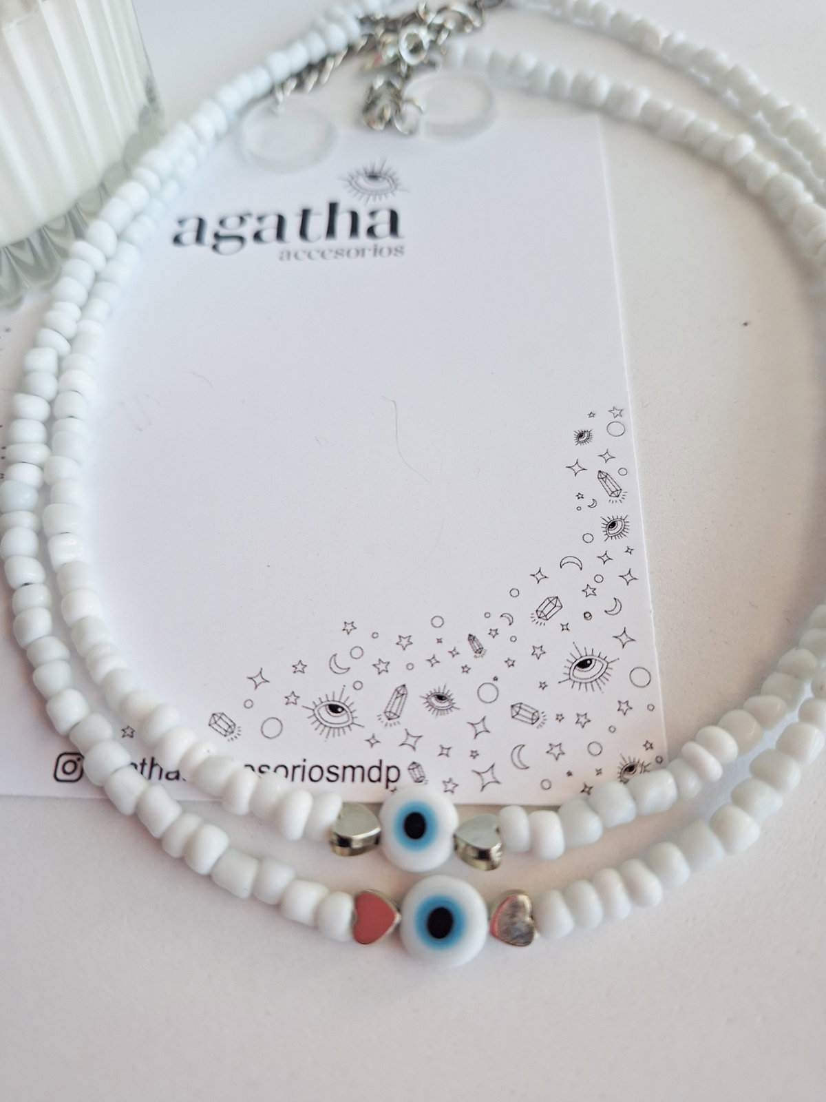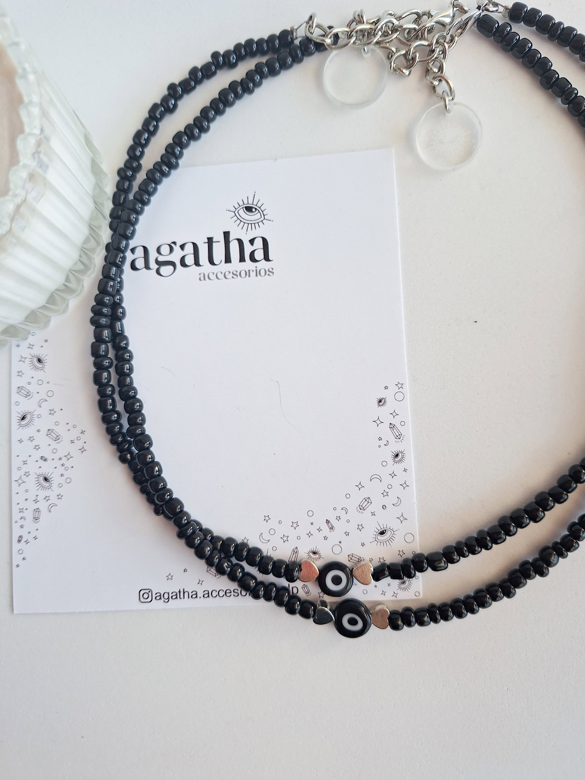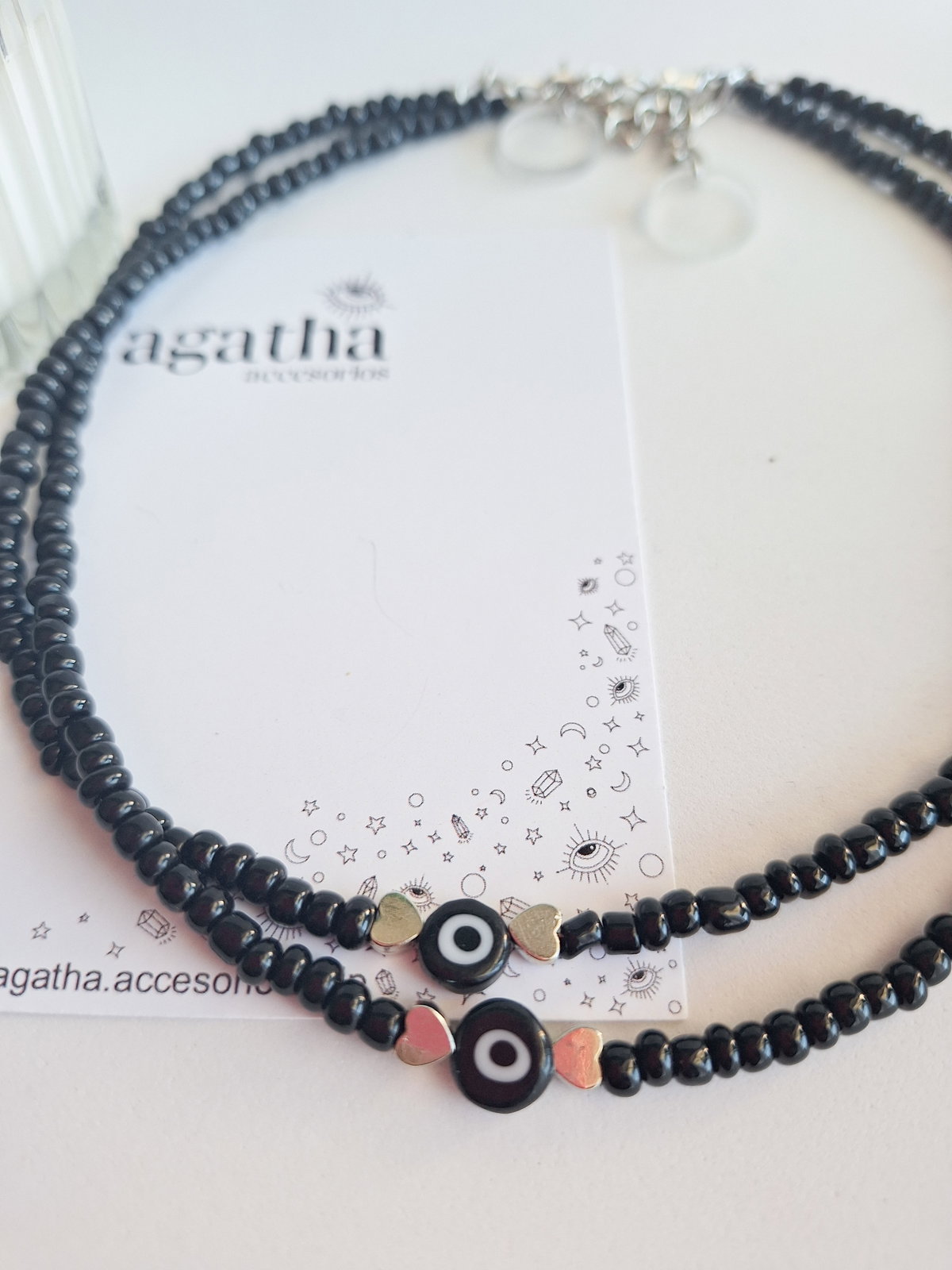 - Chocker realizado con mostacillones, separadores de fundición y ojo turco de vidrio. Cierre regulable. Mide 36 cm más 6 cm de cadena de alargue.