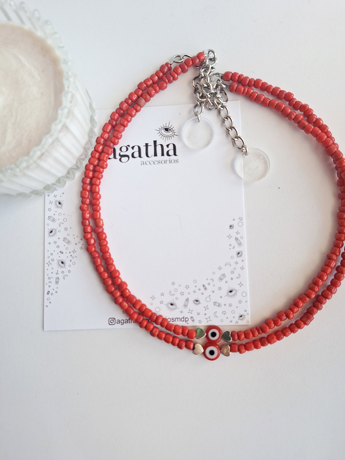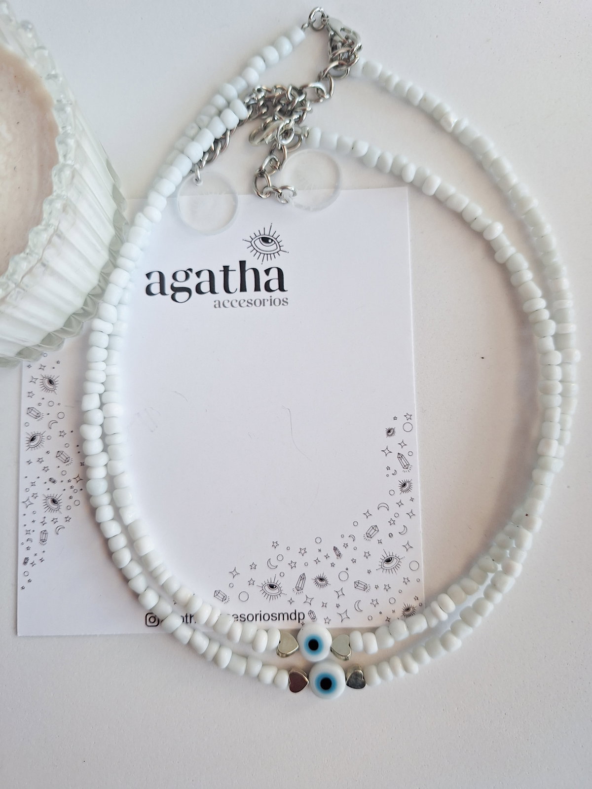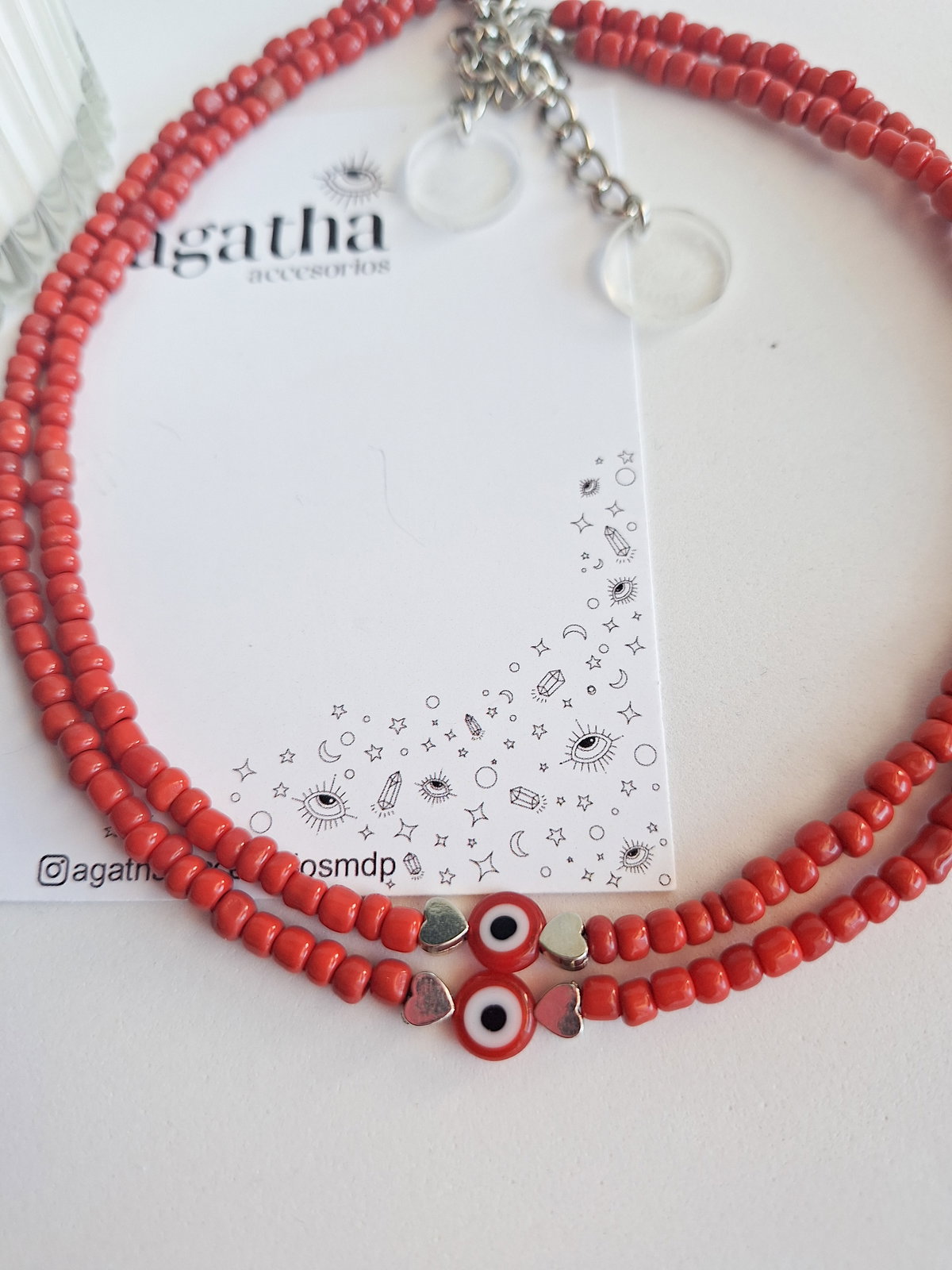 - Chocker realizado con mostacillones, separadores de fundición y ojo turco de vidrio. Cierre regulable. Mide 36 cm más 6 cm de cadena de alargue.