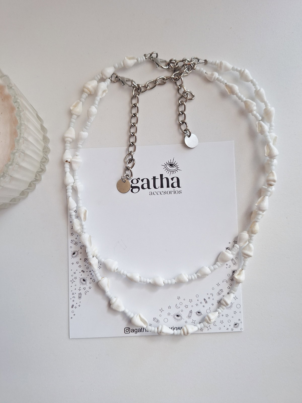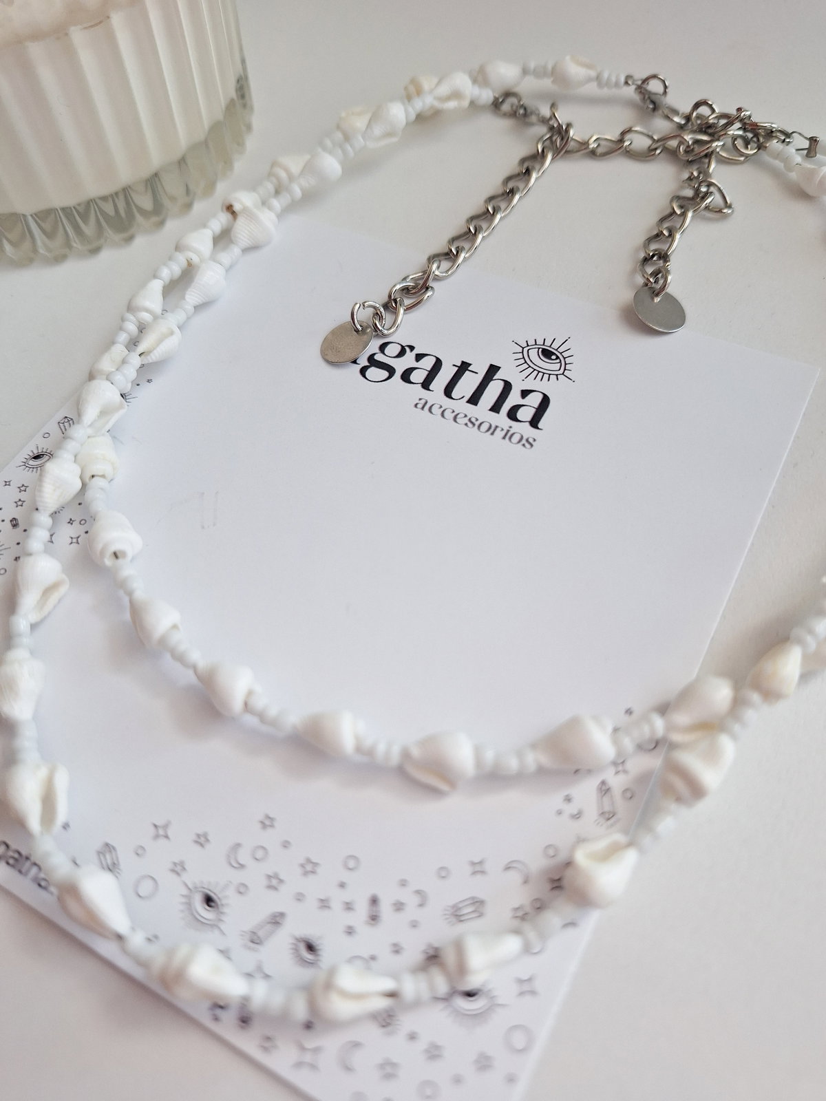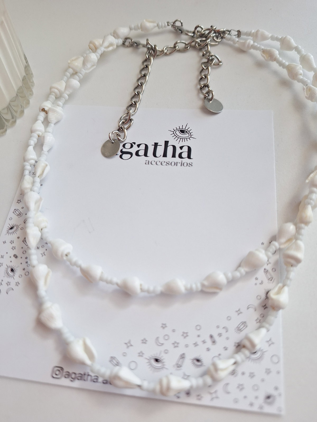- Chocker realizado con mostacillas y caracoles. Cierre regulable con mosquetón. Mide 35 cm más 5 cm de cadena de alargue.