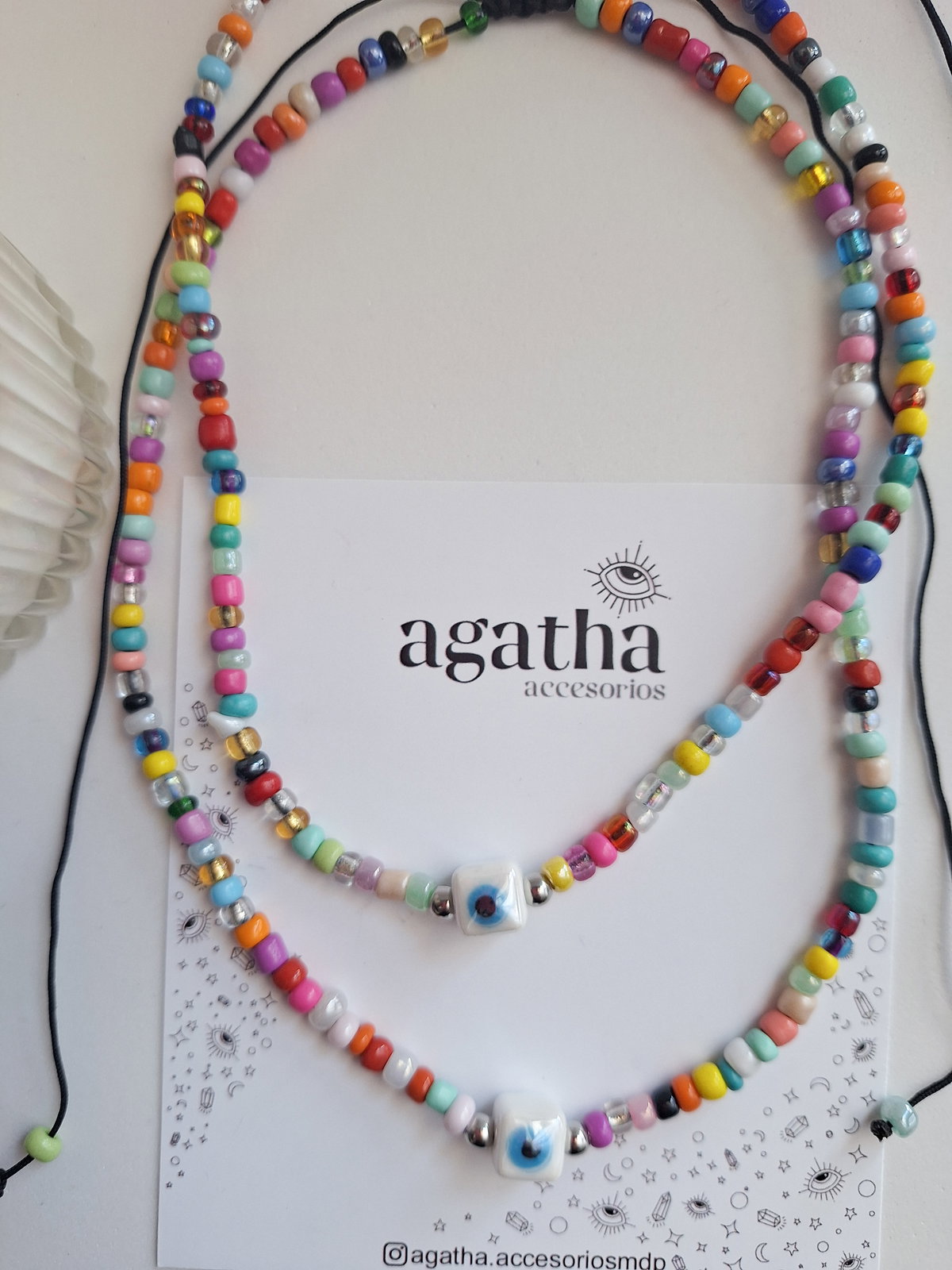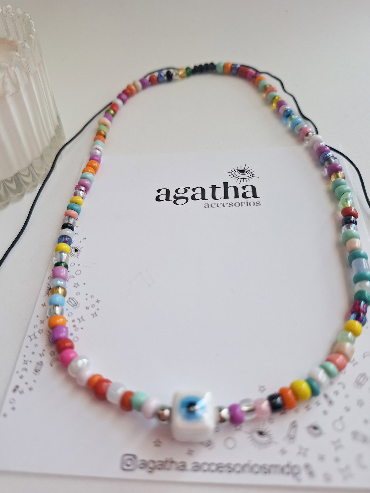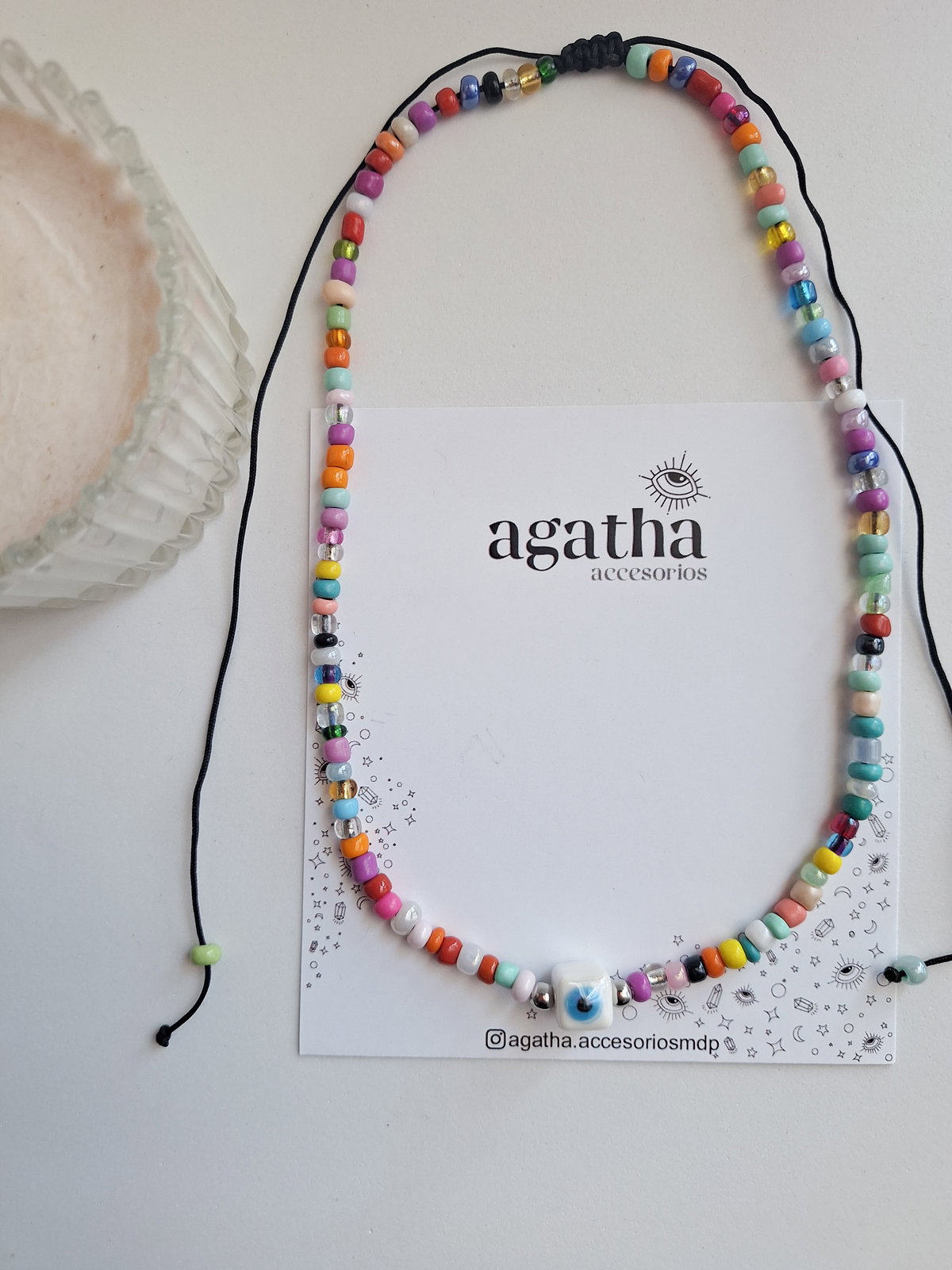 Chocker realizado con mostacillones, separadores de acero quirúrgico y ojo turco de cerámica. Cierre regulable.