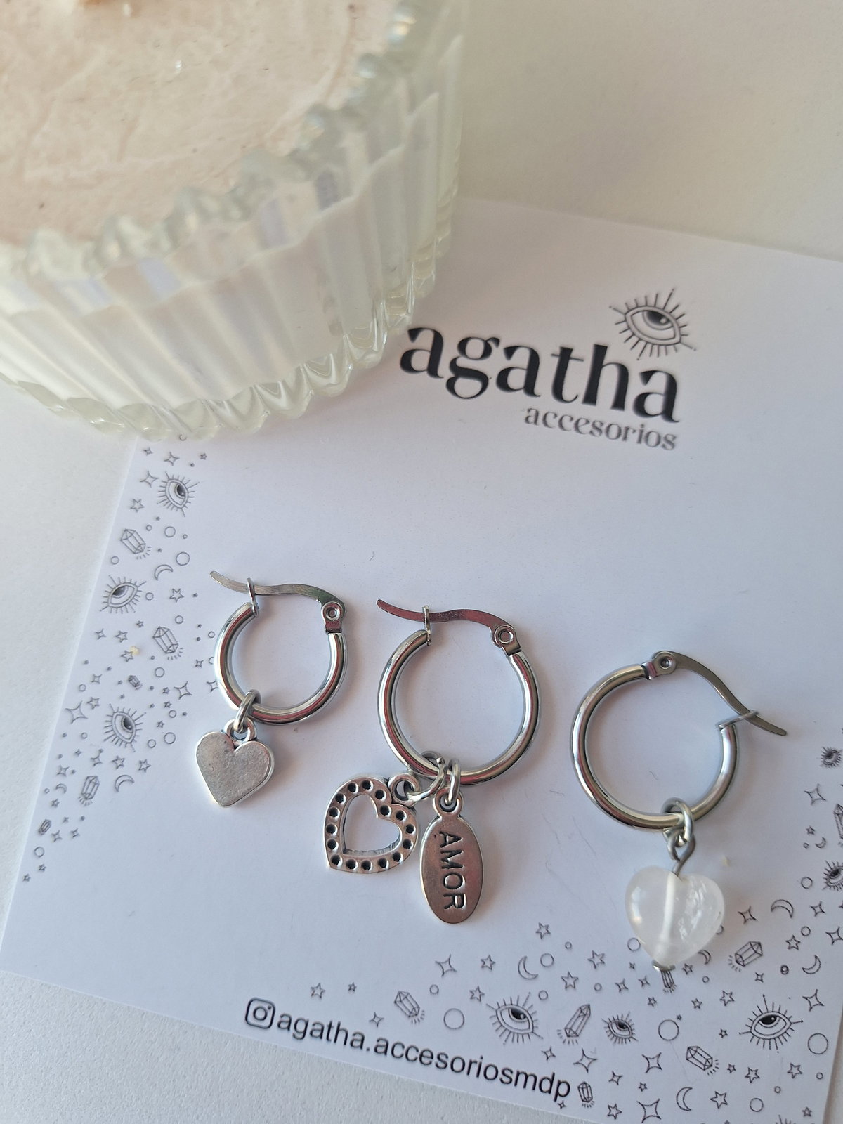 - Set de tres aros de acero quirúrgico de dos tamaños diferentes, dos de 1,5 cm de diámetro y otro de 1 cm de diámetro. Con dijes de fundición y de cuarzo rosa.
