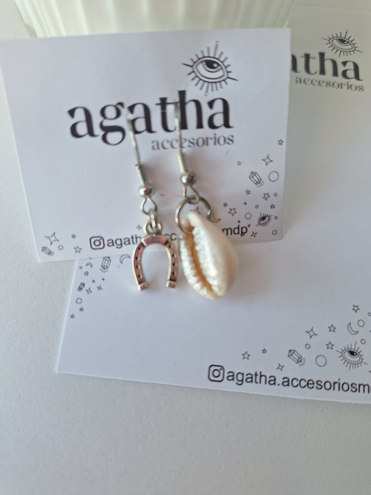 Aros con anzuelo de metal, dije de fundición y caracol buzio.