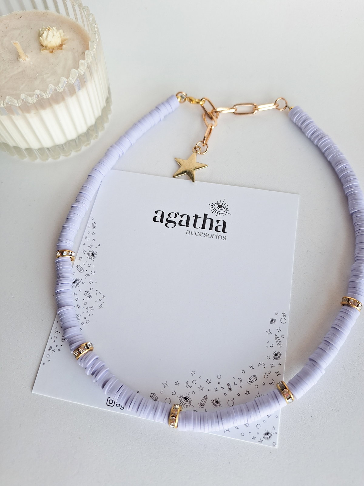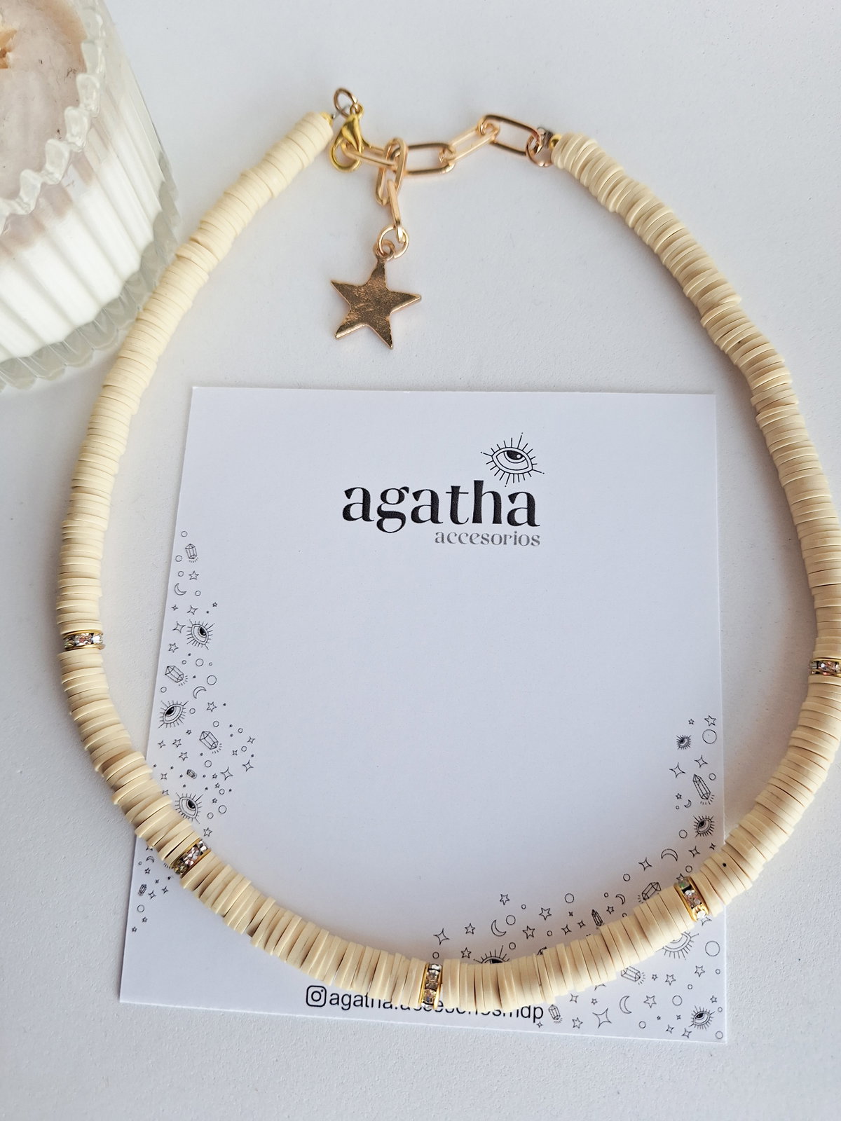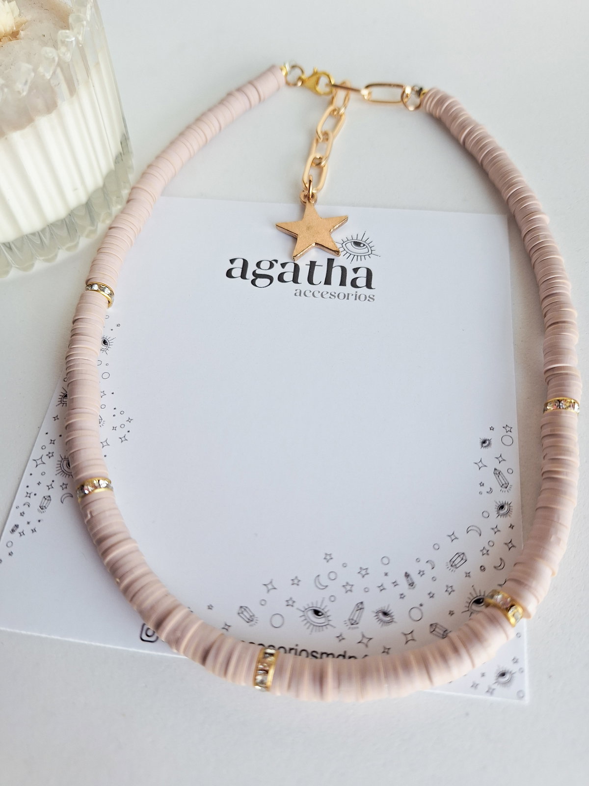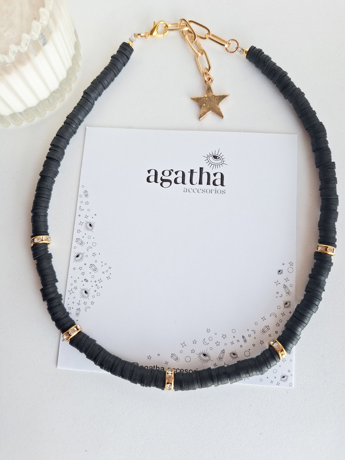 - Collar realizado con cuentas de fimo, separadores de strass y cadena de alargue. Cierre con mosquetón.