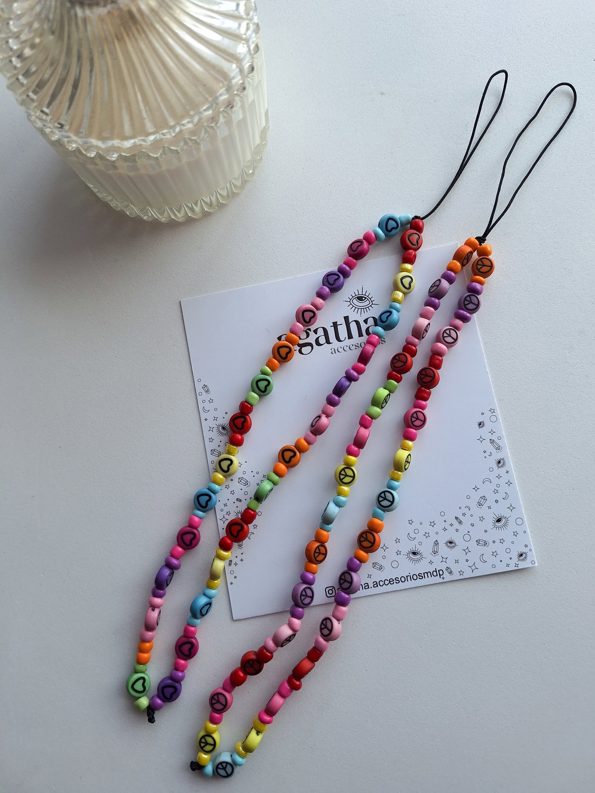 Realizado con hilo chino, mostacillones y dijes de colores.