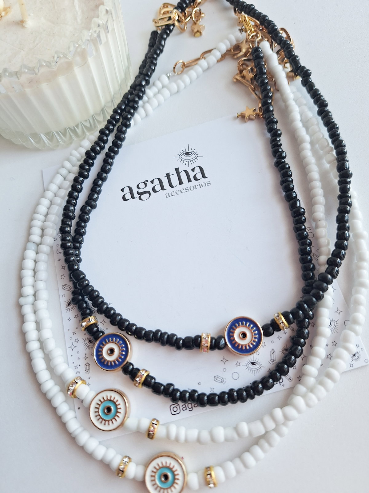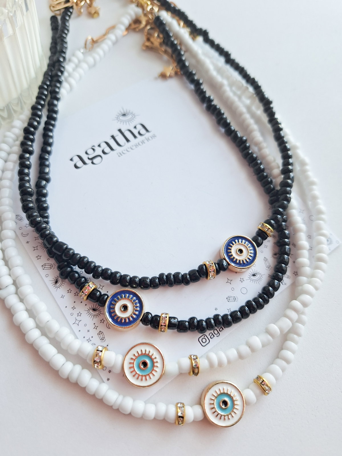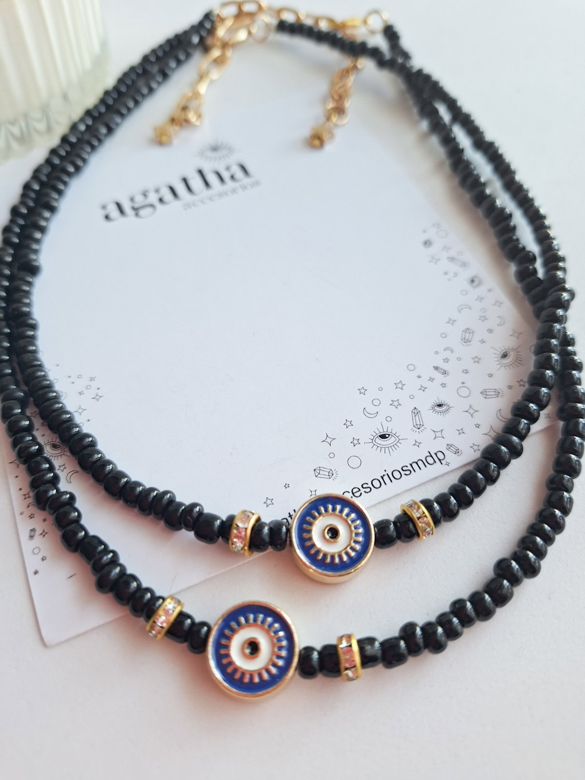 - Collar realizado con mostacillones, separadores de strass y ojo esmaltado. Cierre con mosquetón y cadena de alargue.
