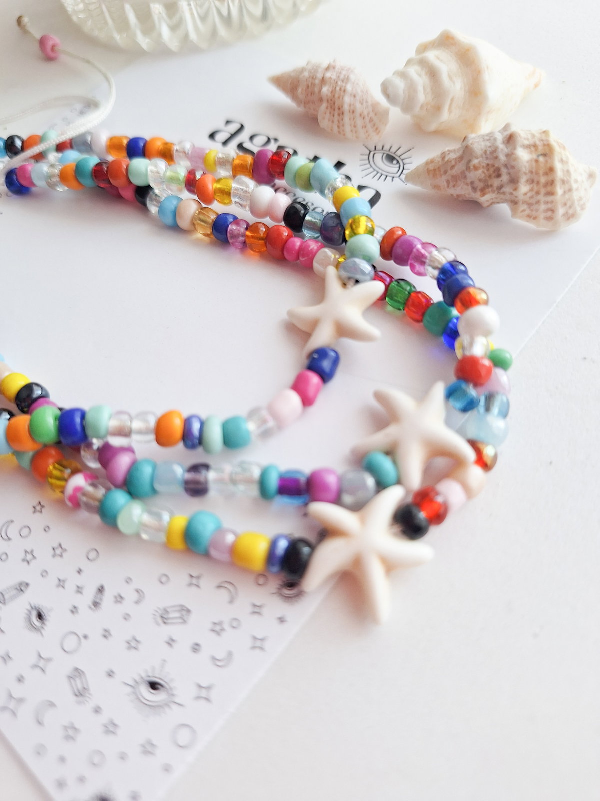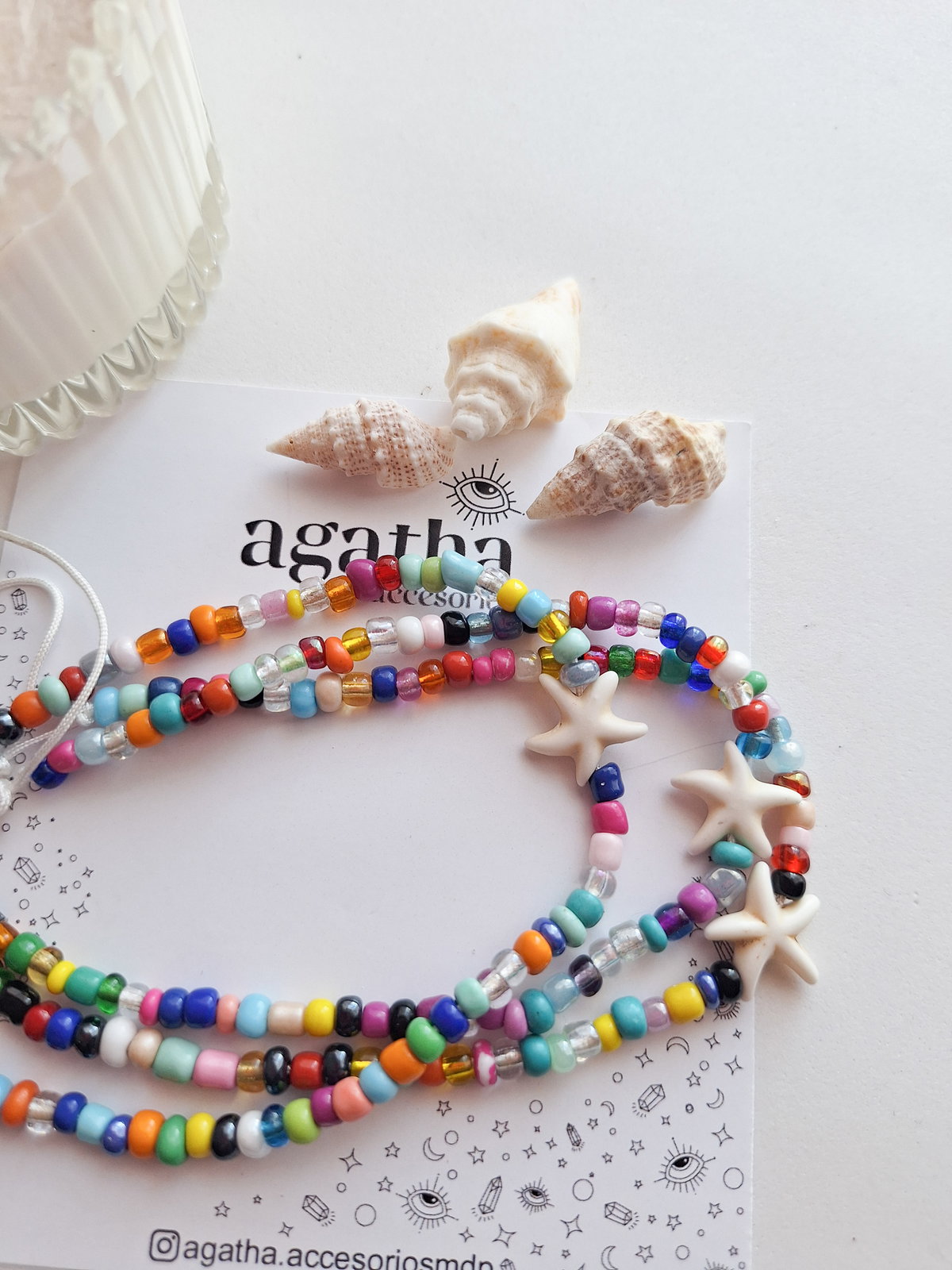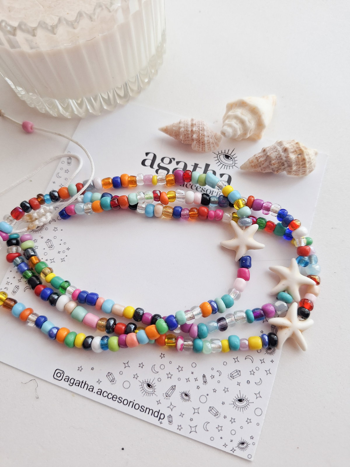 Tobillera realizada con mostacillones, hilo chino y dije de piedra reconstituida. Cierre regulable.