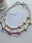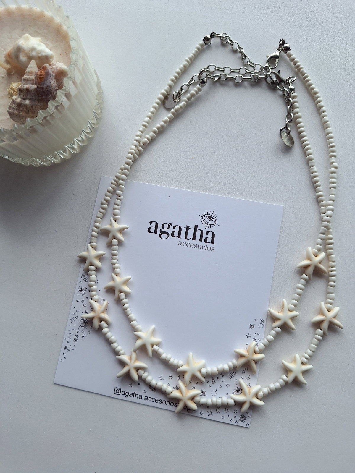 - Collar realizado con mostacillas y estrellas de piedra reconstituida. Con cadena de alargue, cierre regulable.
