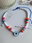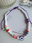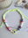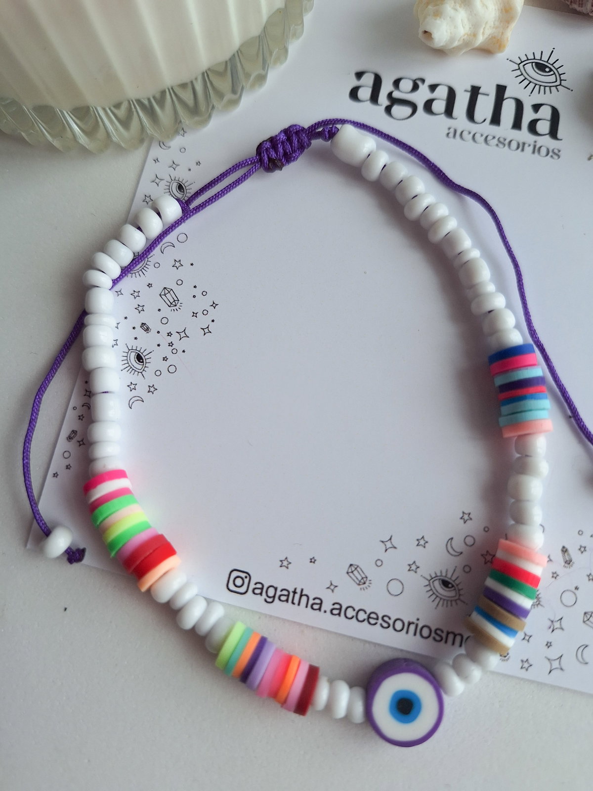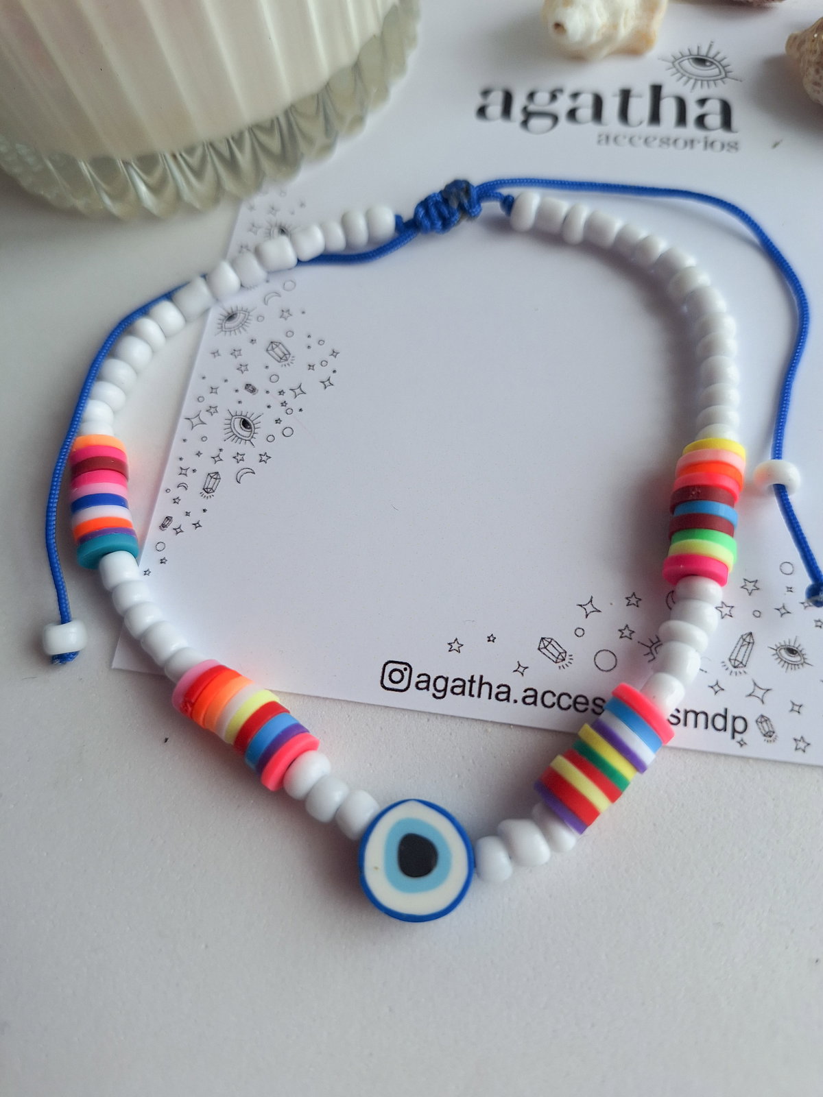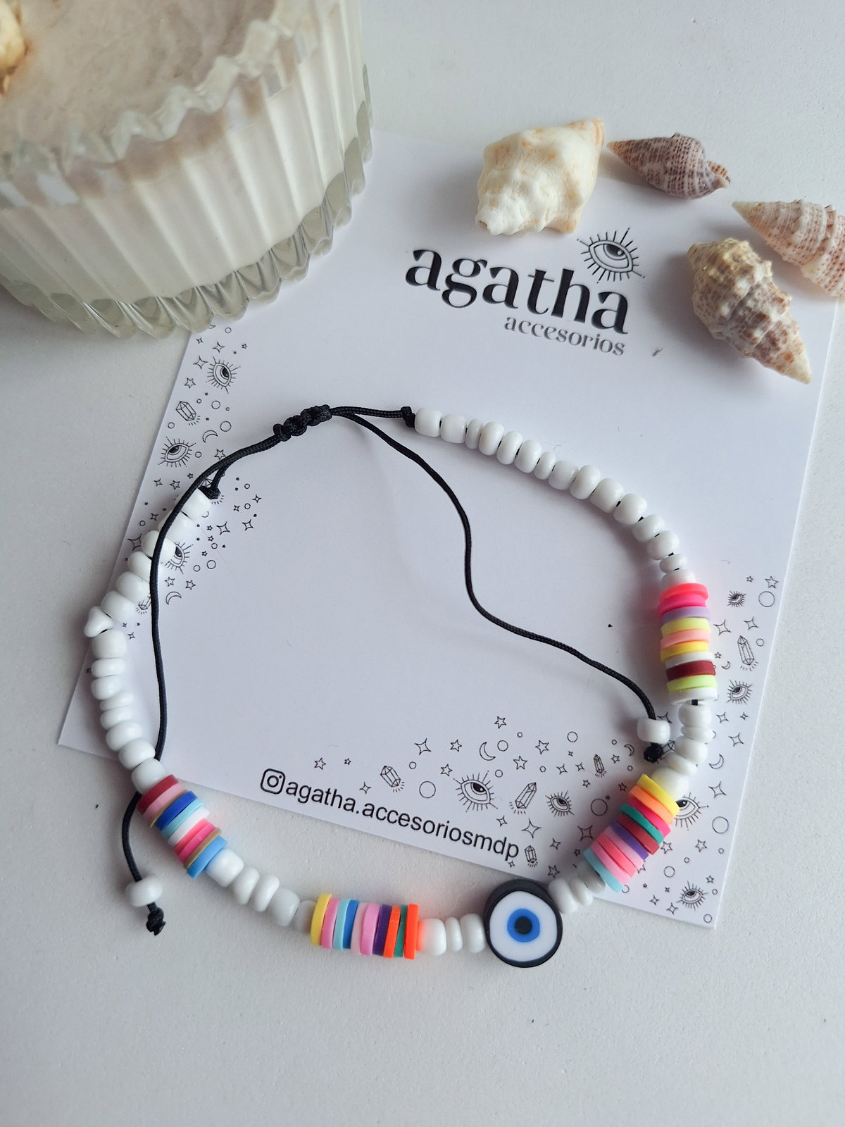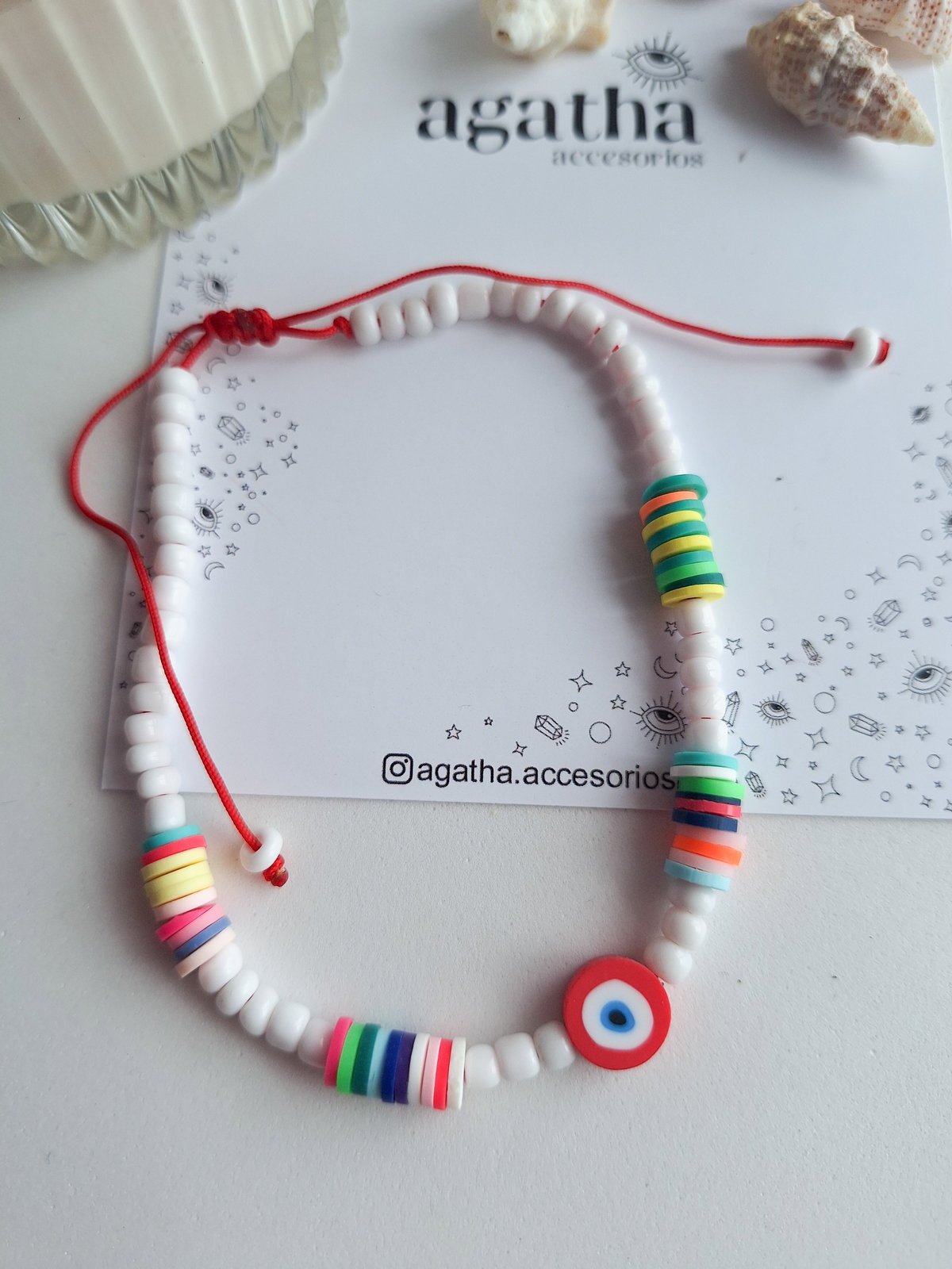 Tobillera realizada con hilo chino, mostacillones blancos y fimo. Cierre regulable.