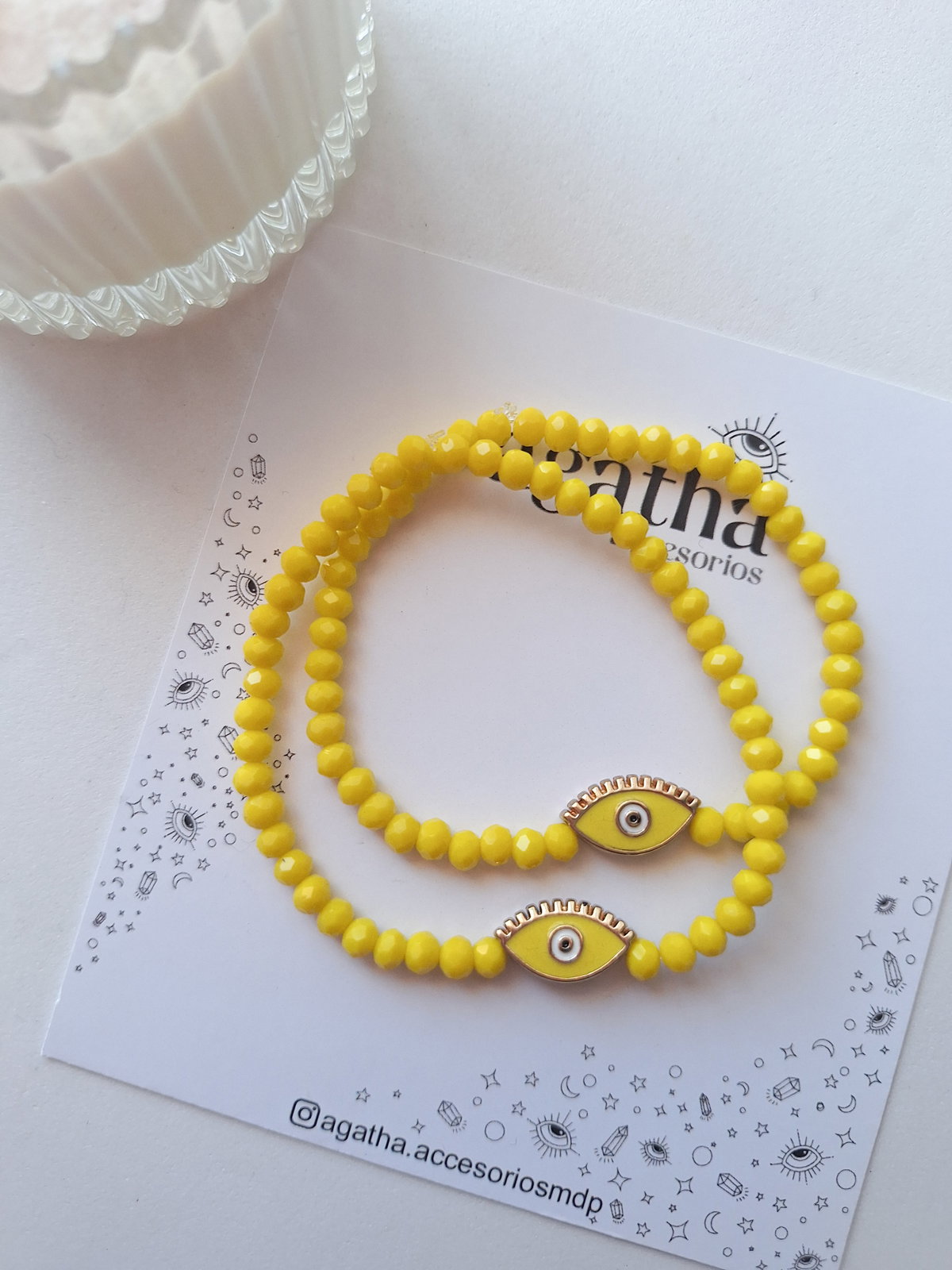 - Pulsera realizada con cristales de 4 mm en color amarillo, con ojo turco d3 fundición esmaltado. Elastizada.