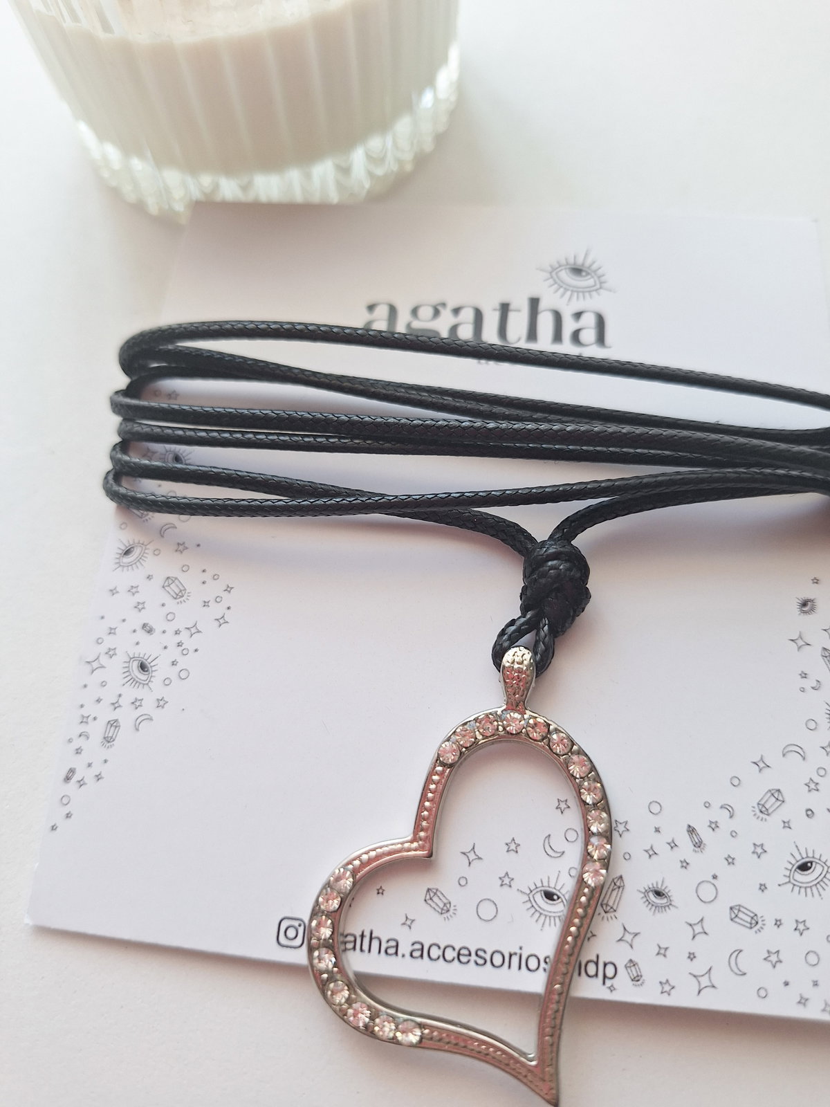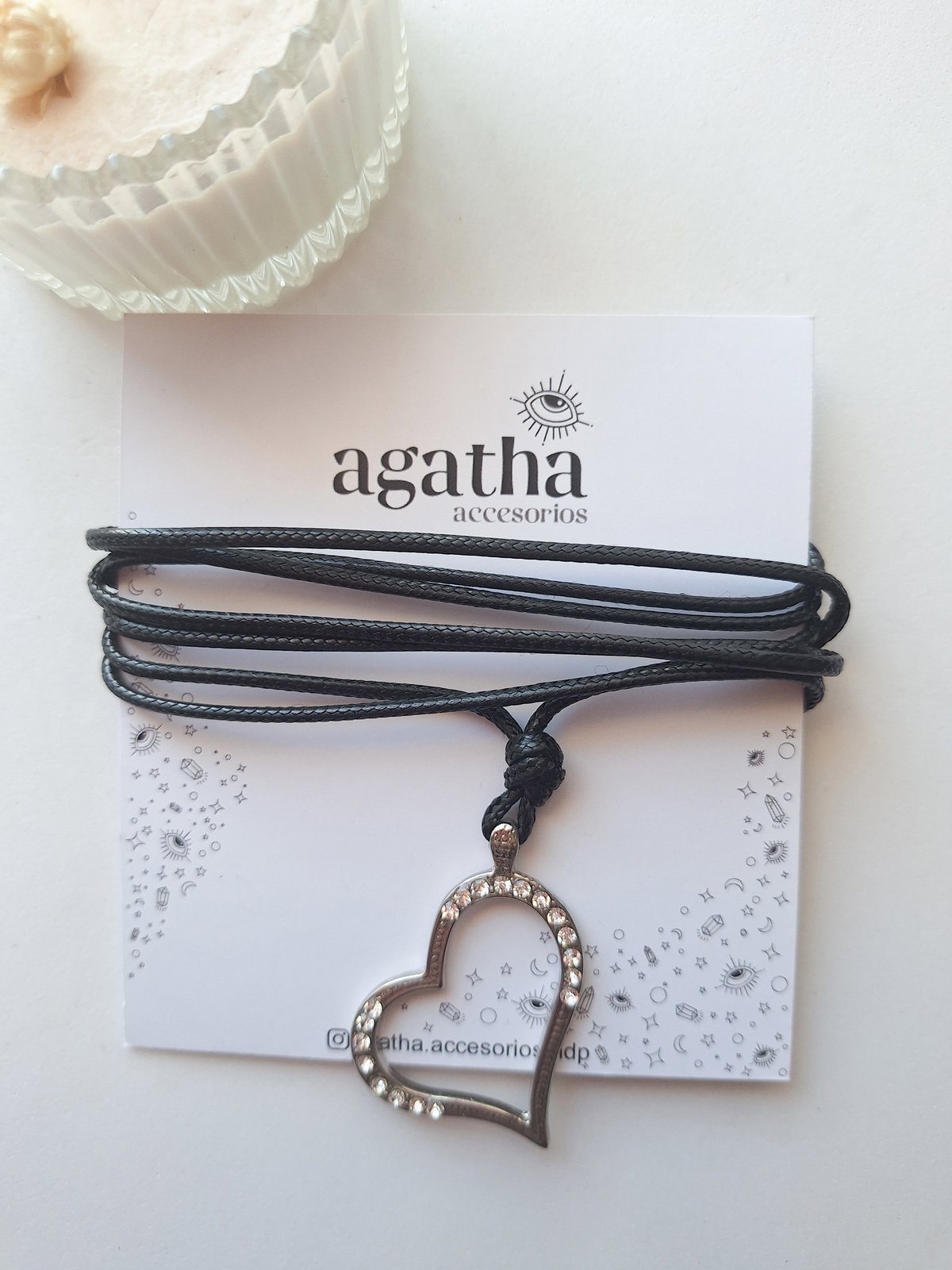 Lazo realizado con hilo de 2 mm de grosor. Dije con strass y baño de plata. Mide 1,50 mt.