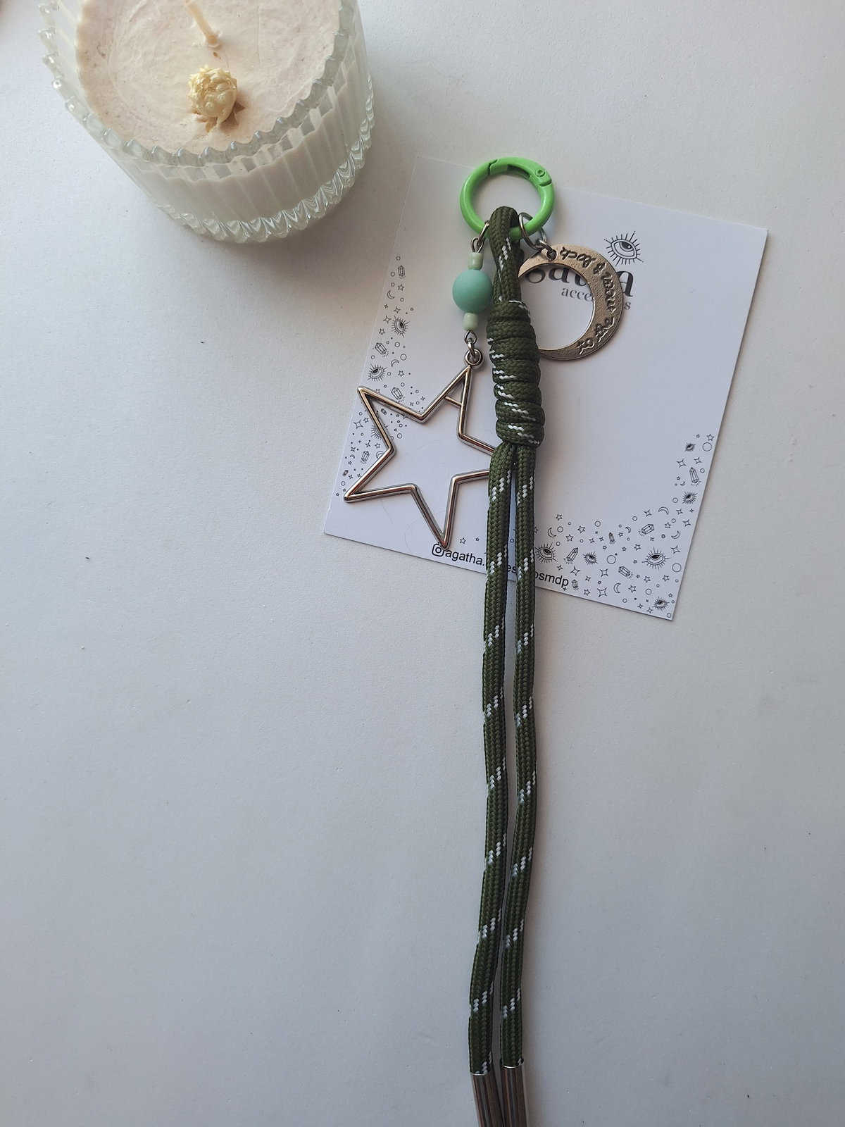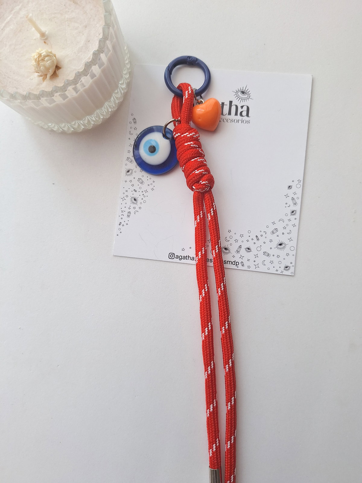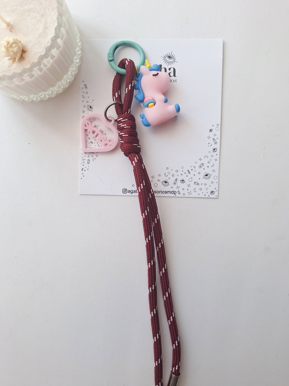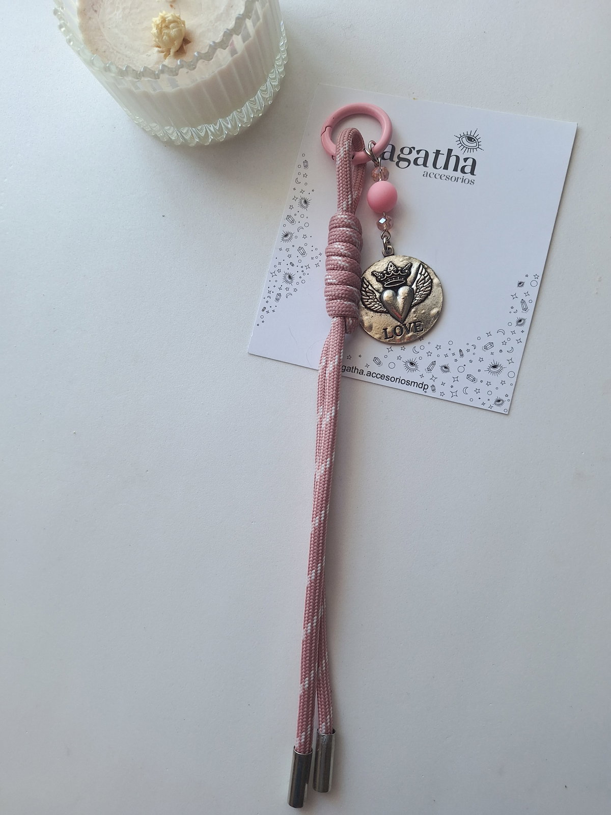 Llavero realizado con cordón, diferentes dijes y mosquetón redondo.