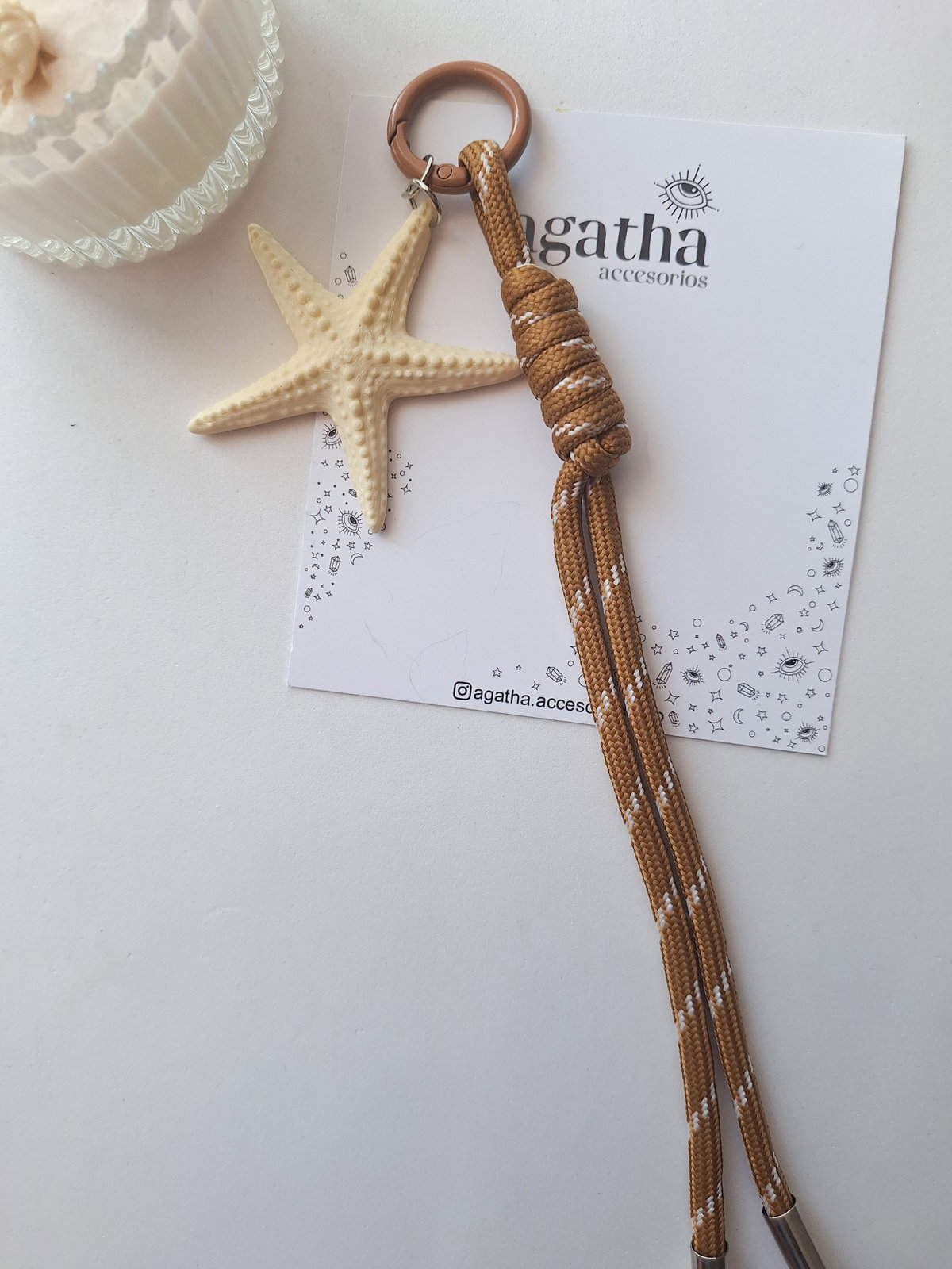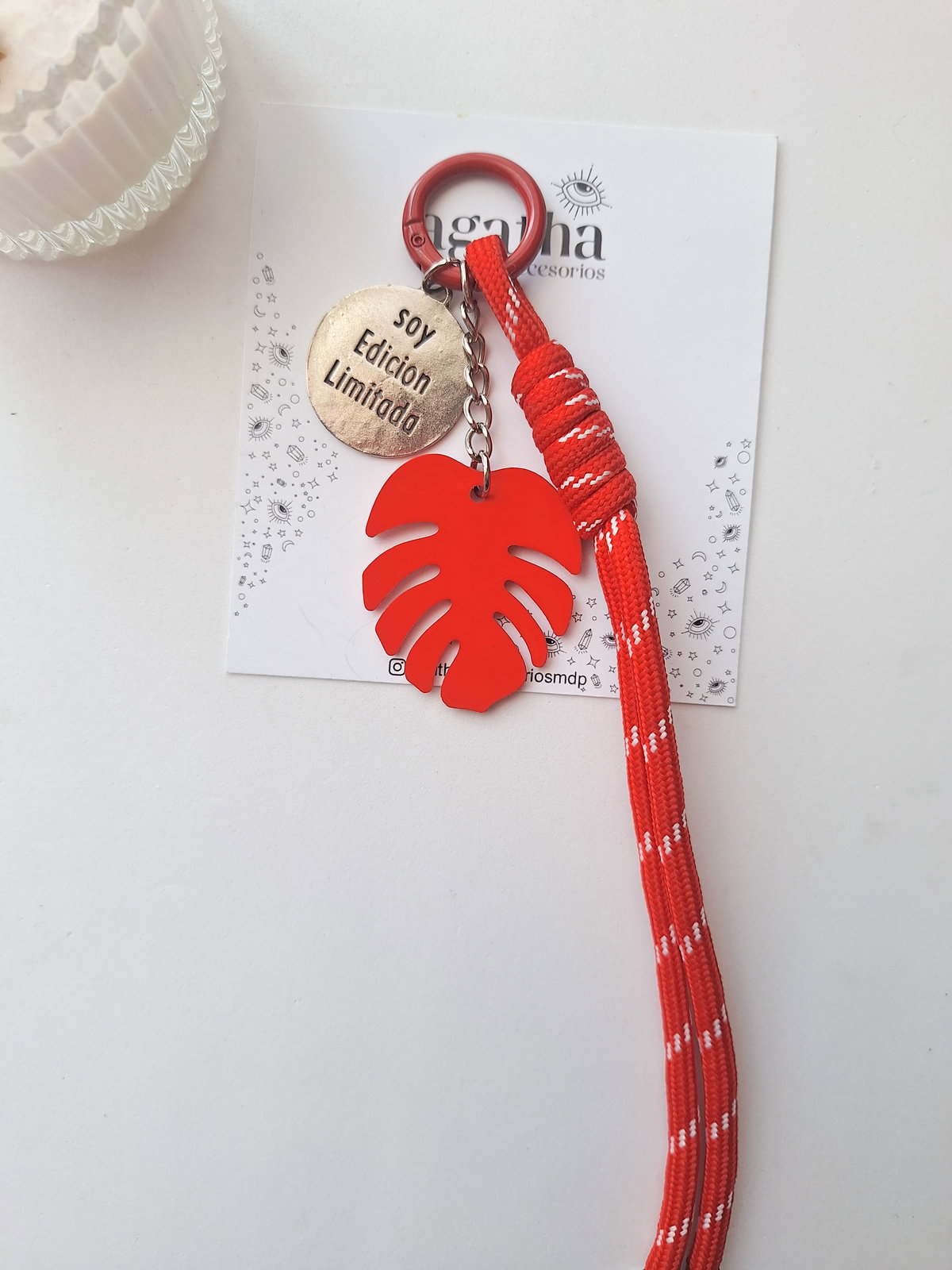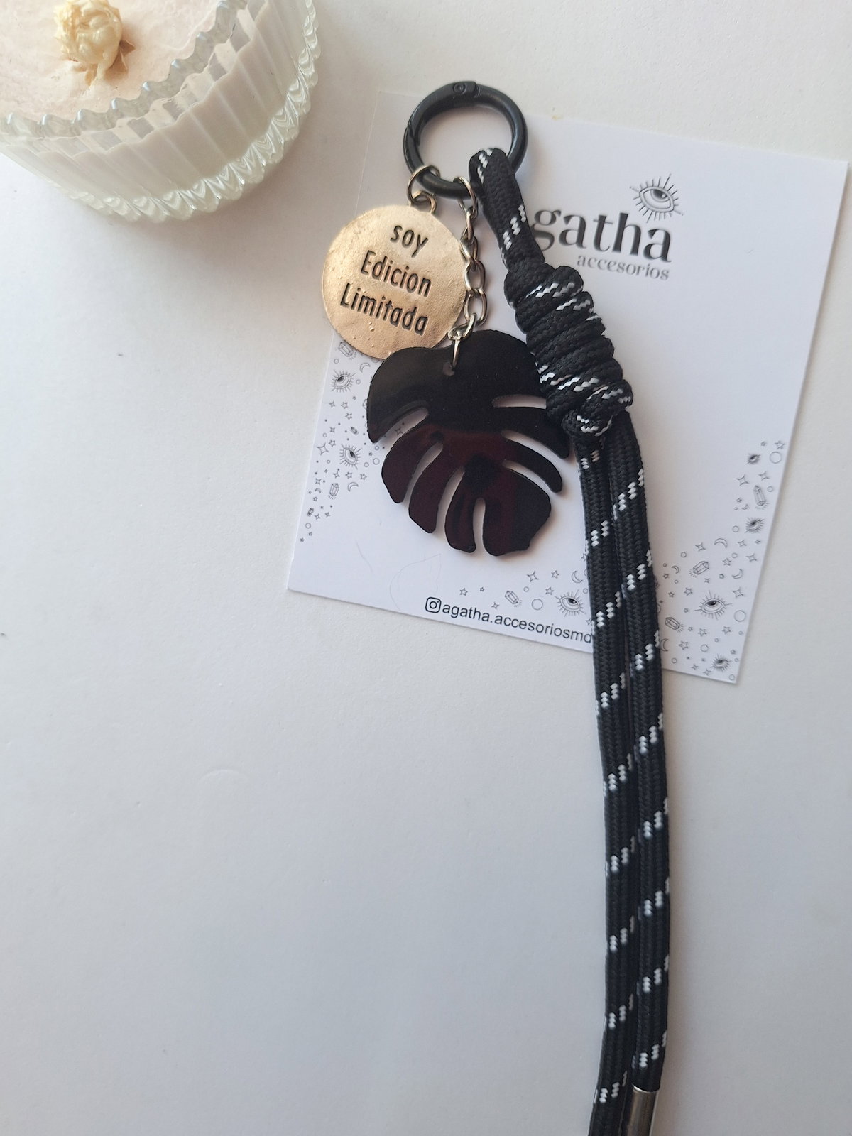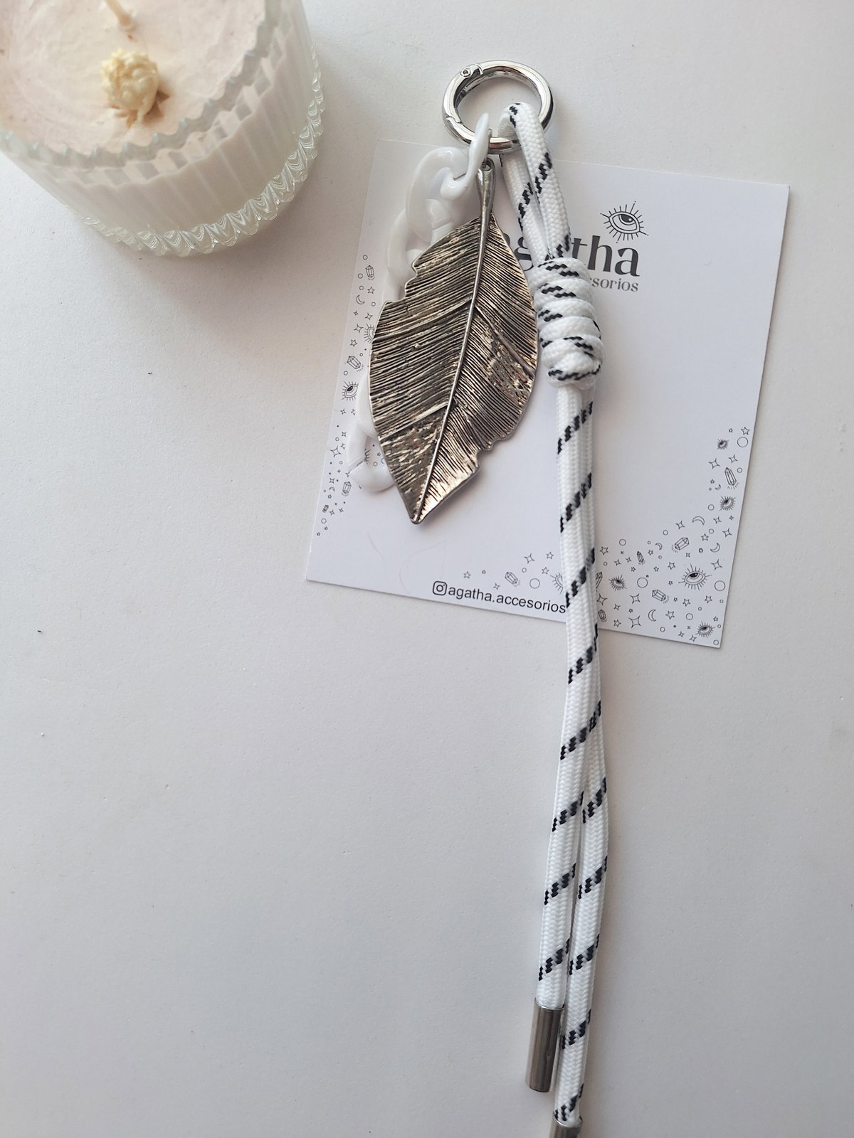 Llavero realizado con cordón, diferentes dijes y mosquetón redondo.