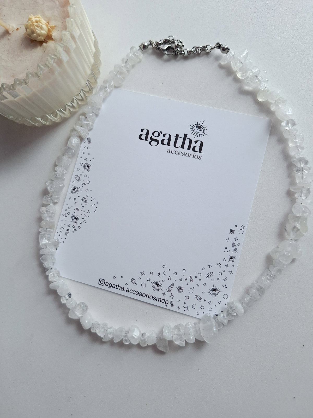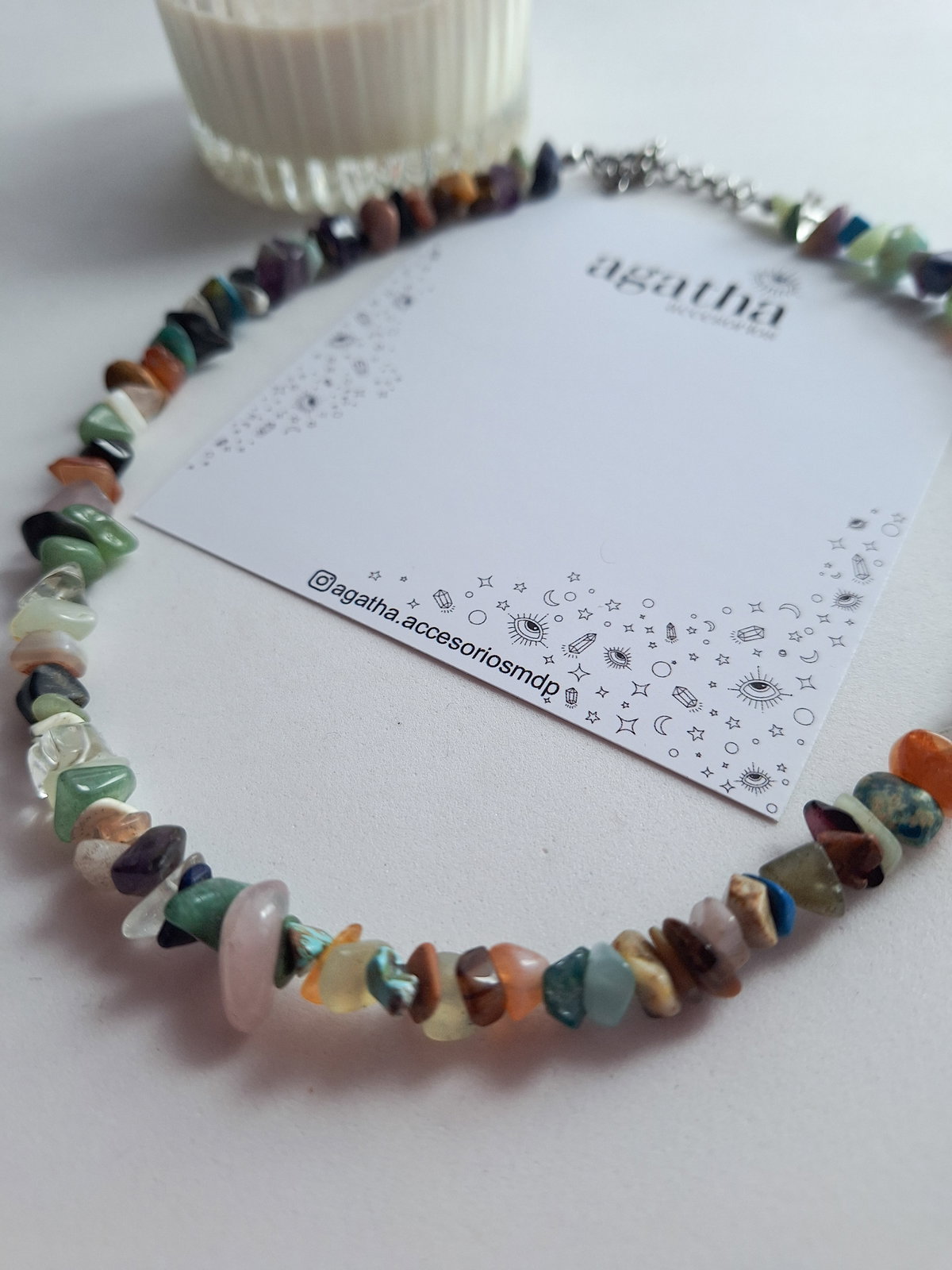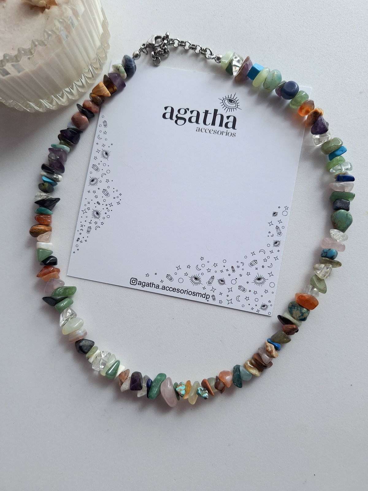 Collar realizado con escallas de piedras naturales, con terminaciones de acero quirúrgico. Es tipo chocker, de 40 cm incluyendo cadena de alargue.