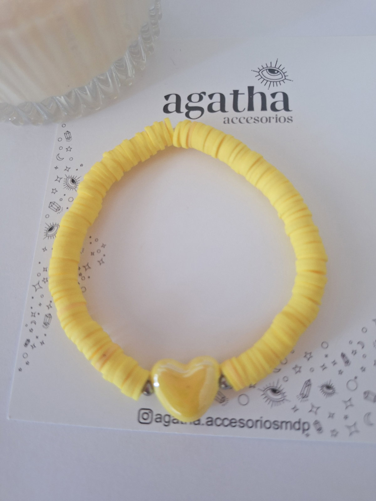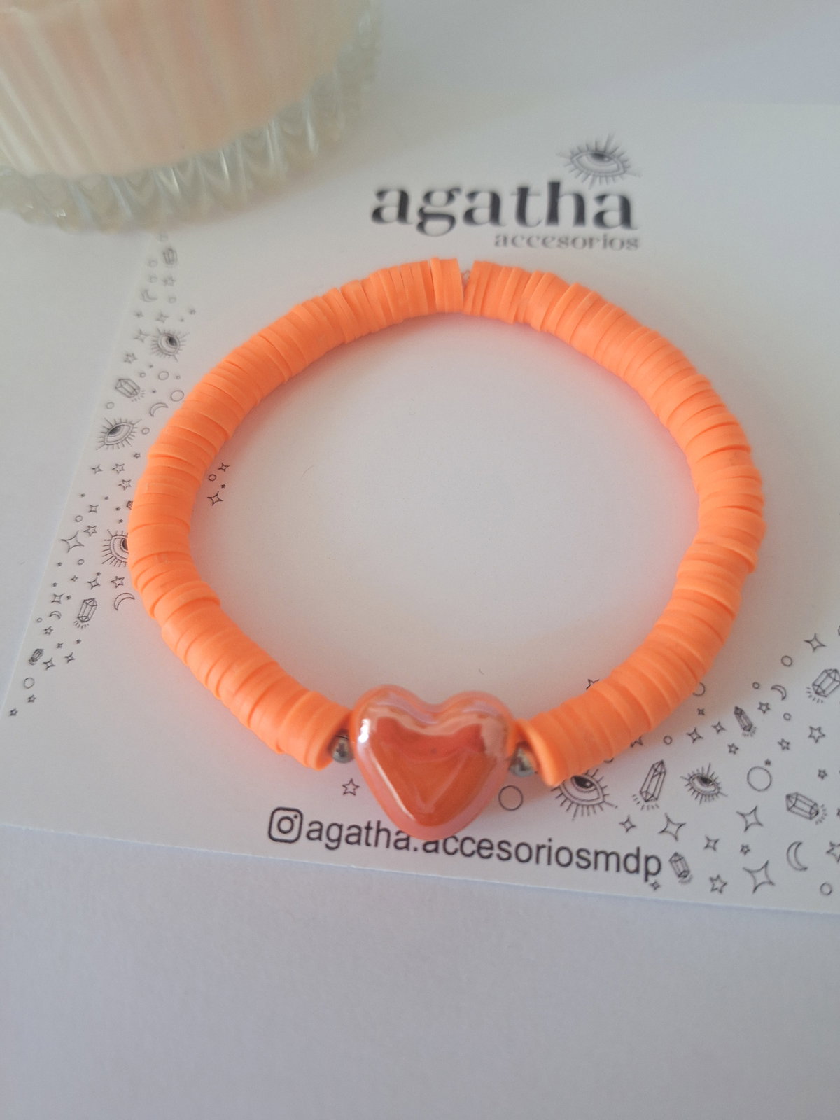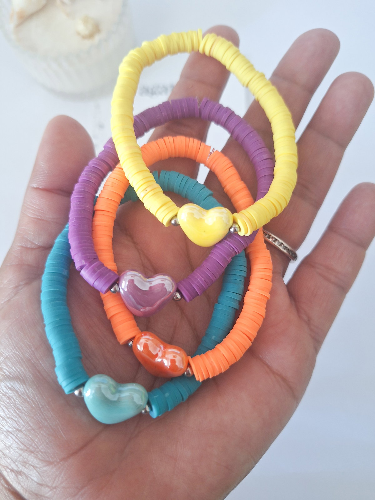 - Pulsera realizada con cuentas de fimo, corazón de cerámica y separadores de acero quirúrgico. Elastizada.
