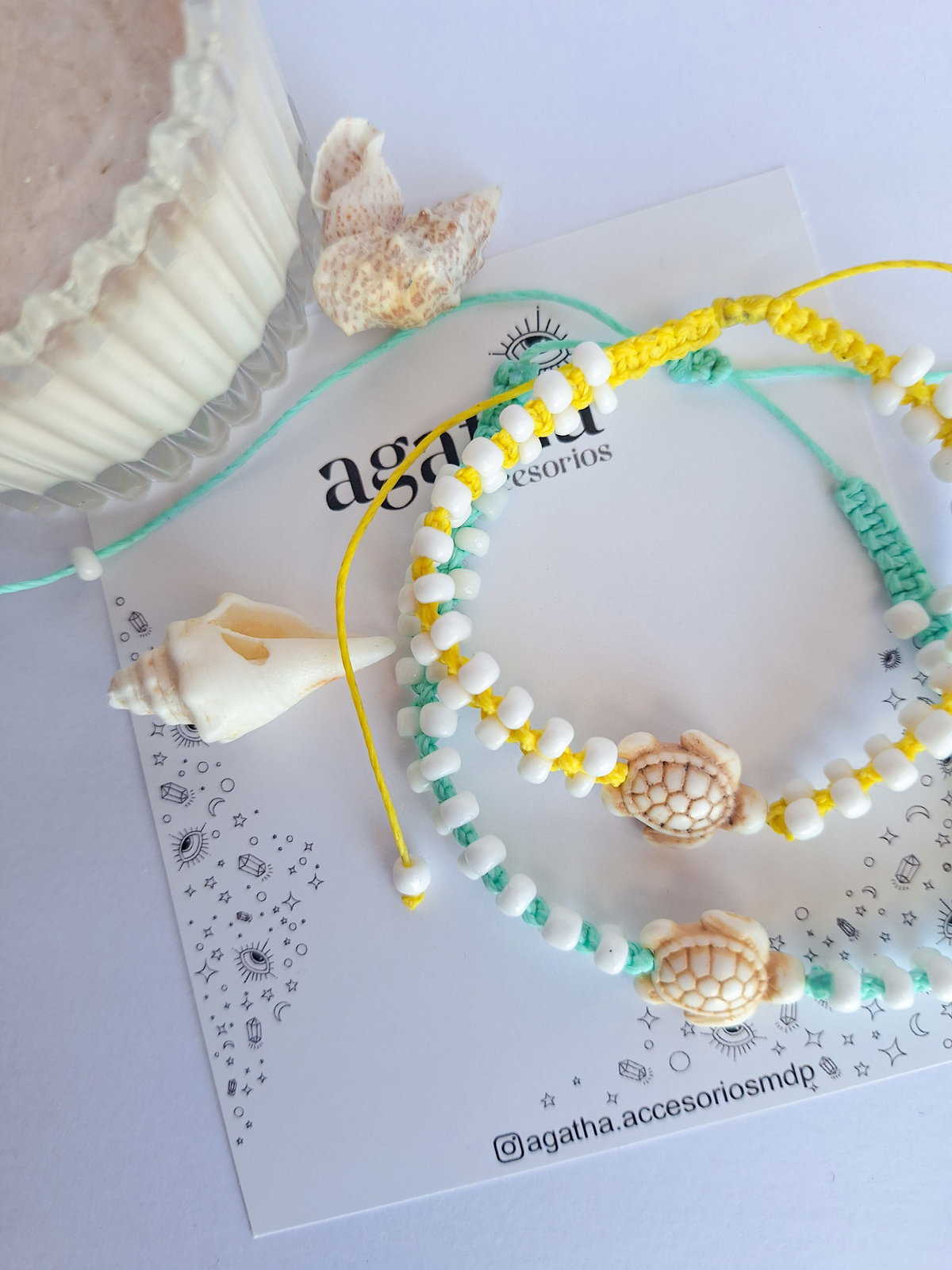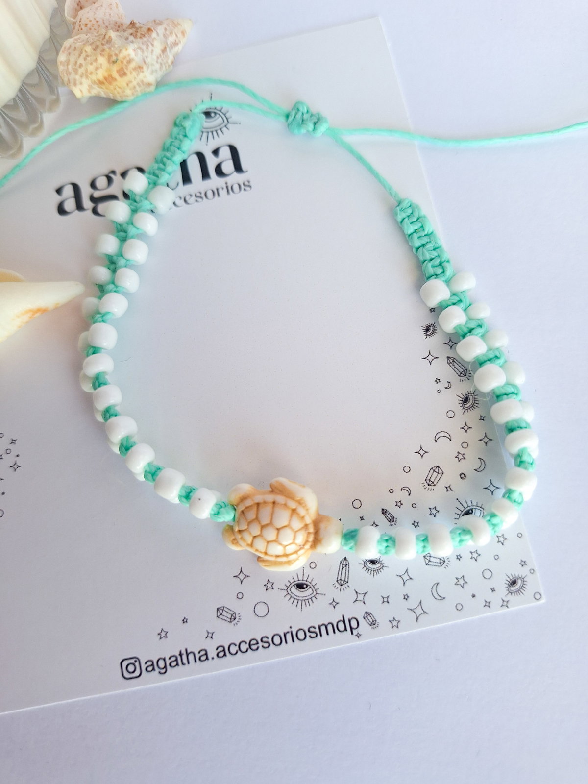- Tobillera realizada con hilo encerado, mostacillones y dije de tortuga de piedra reconstituida. Cierre regulable.